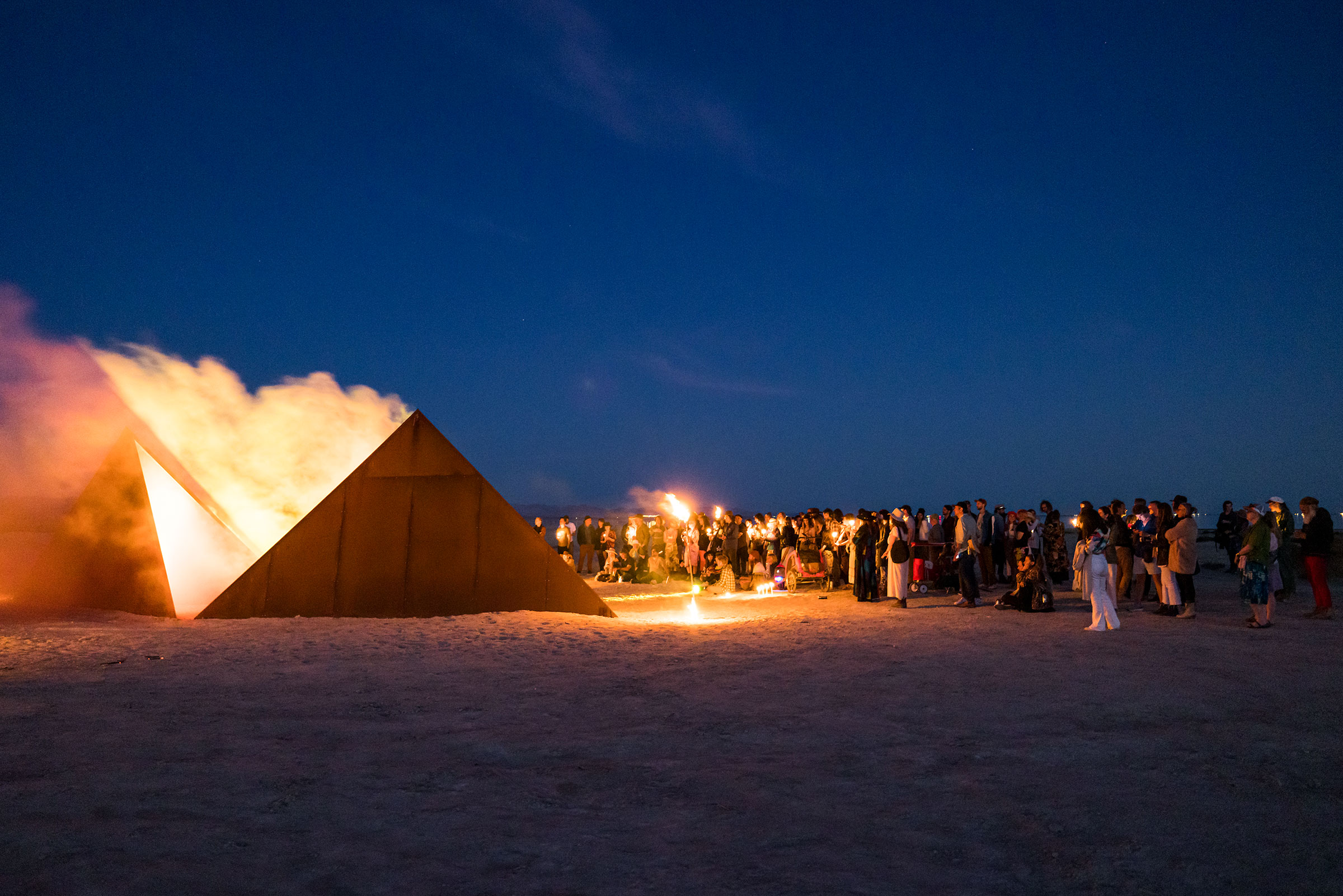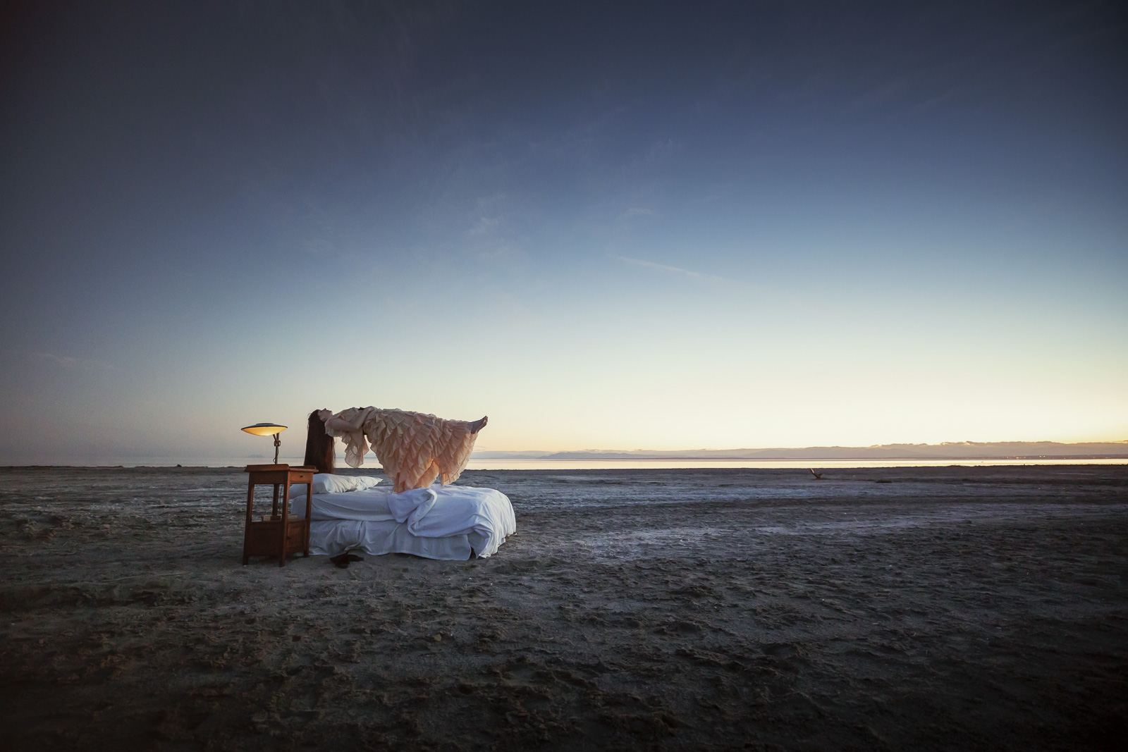 Los Angeles artist Joséphine Wister Faure brought a performance piece called “Levitation” to the 2019 Bombay Beach Biennale. It featured a sleeping woman (performed by Tiger Kaufman) hovering in mid-air as twilight descended over the Salton Sea. Faure described it as a “a moment suspended in time set on a beach made of salt and bones.”