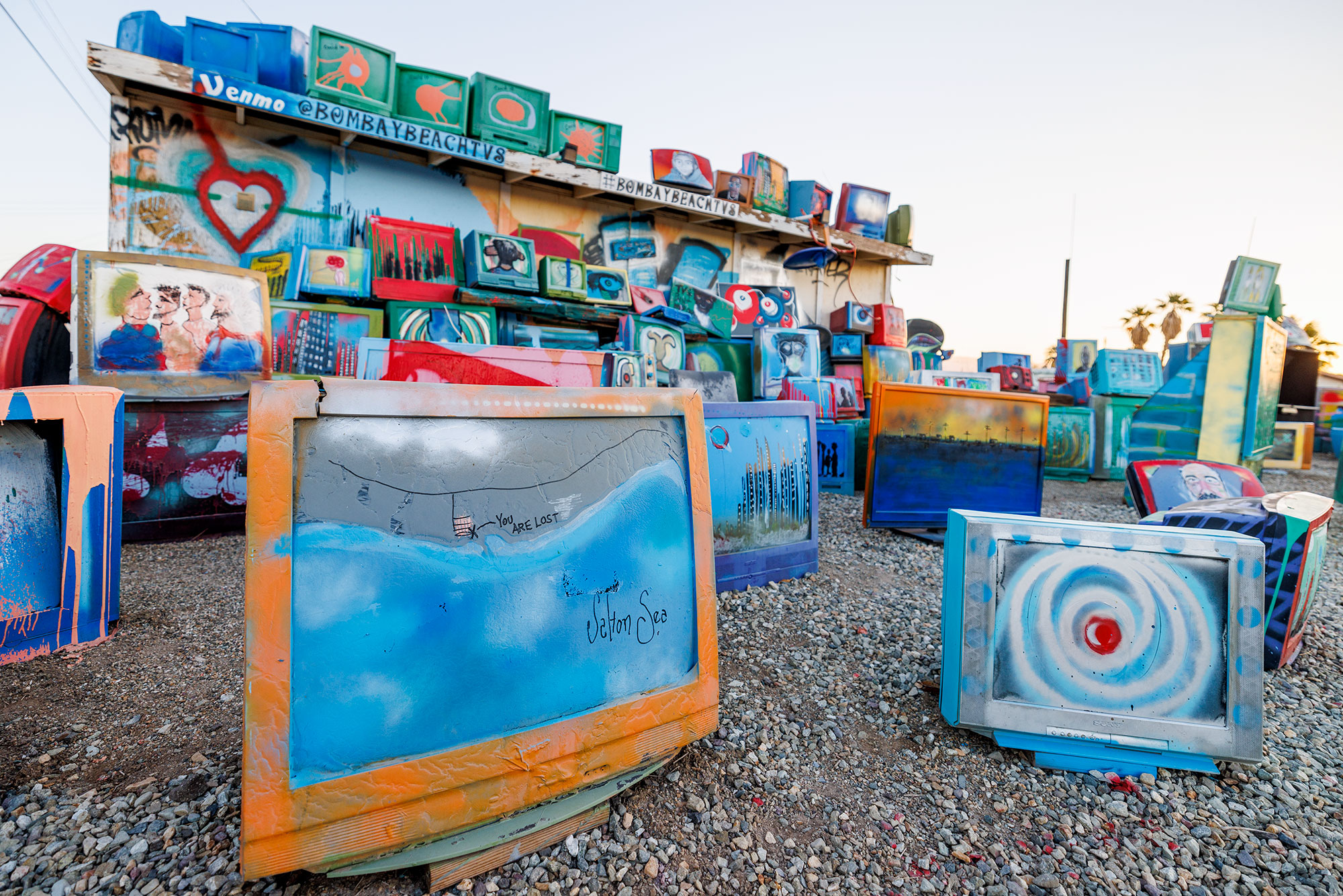 Bombay Beach TVs, an installation on the edge of town, was created from discarded television sets. It takes up edgy themes like viral contagion, toxic dust clouds and alien invasions. The TV at lower left shows a map of Bombay Beach with the words, “You are lost.”