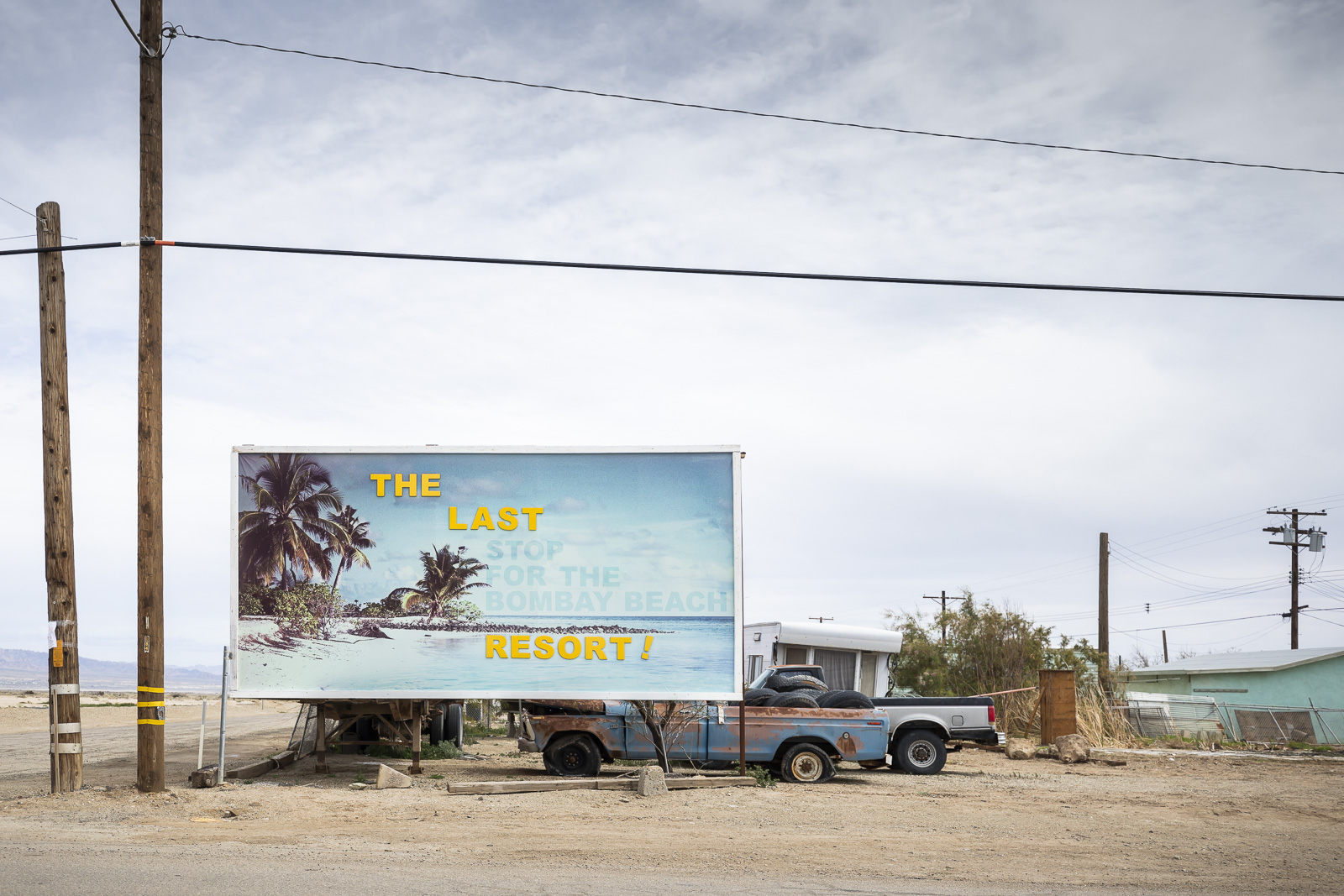 A billboard art installation by Stefan Ashkenazy greets visitors as they arrive in Bombay Beach. With its poignant double-meaning, the piece hearkens back to the town’s heyday when it was a thriving resort community and popular destination for fishing and water-skiing.