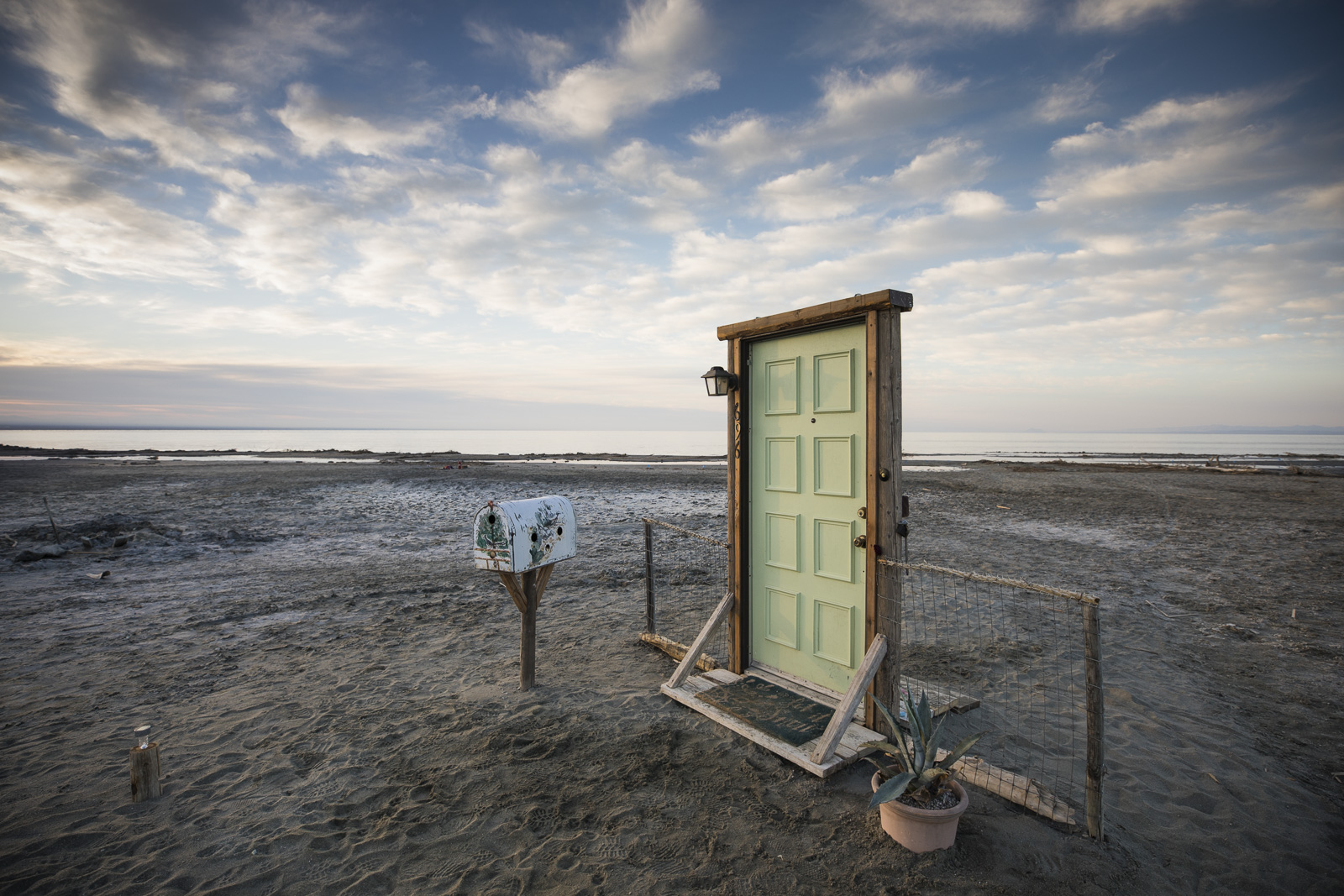 “The Open House,” an artwork by Keith Jones and Lee Henderson, features a front door that opens out to the expansive Salton Sea.