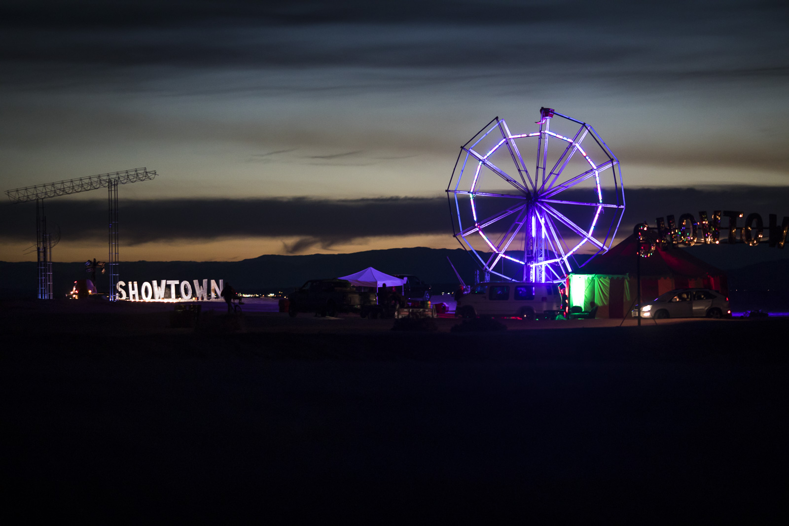Night falls over Showtown, a large installation and performance space on the waterfront created by Stefan Ashkenazy.