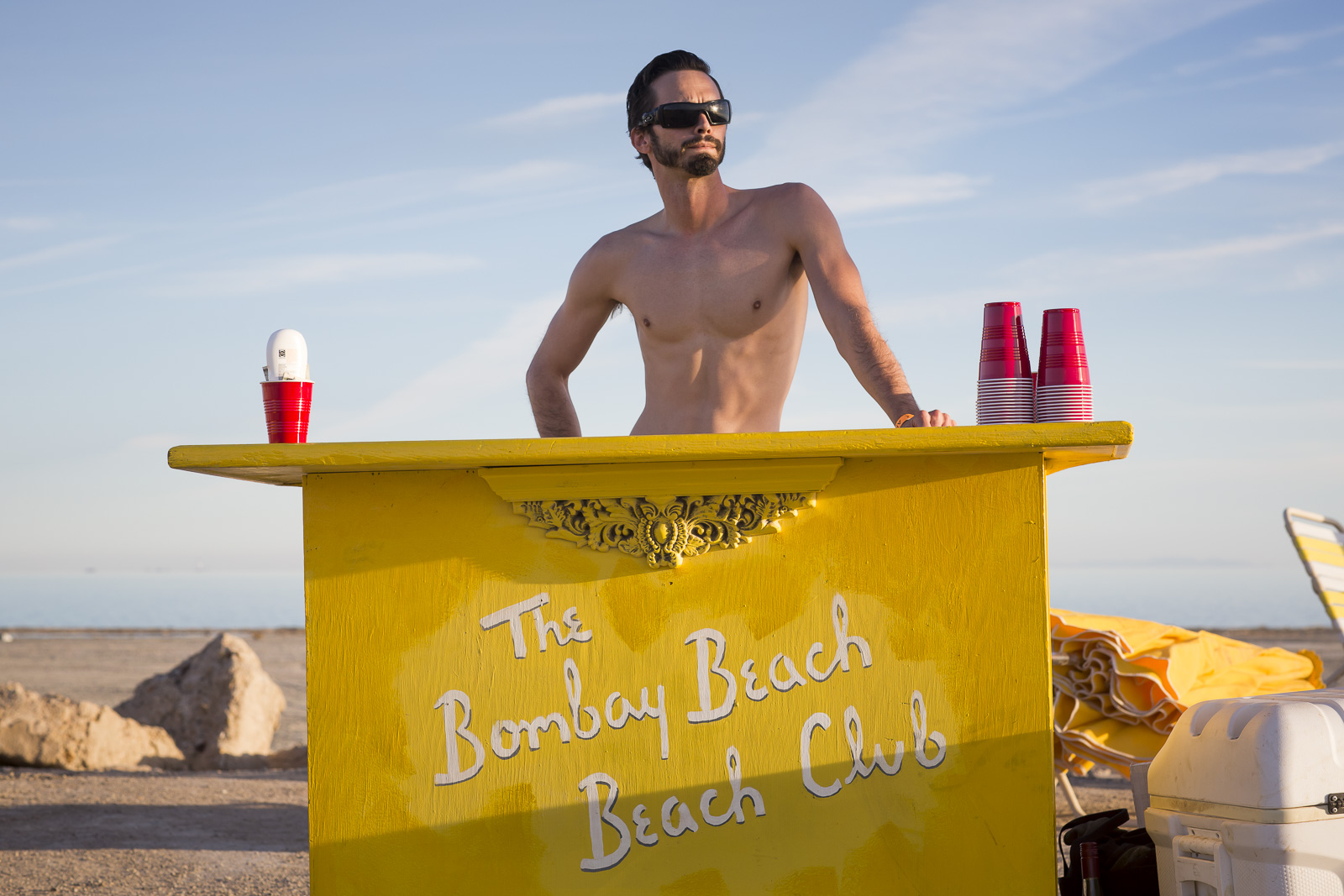 Cameron, a Los Angeles performance artist and Biennale veteran, serves free drinks at the “Bombay Beach Beach Club” wearing only a yellow Speedo.