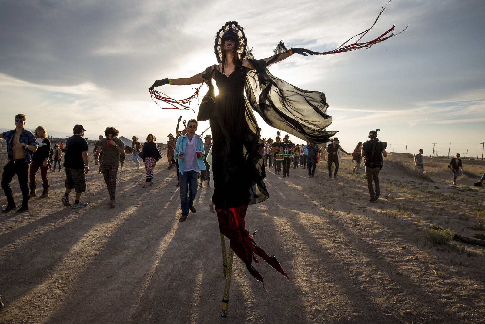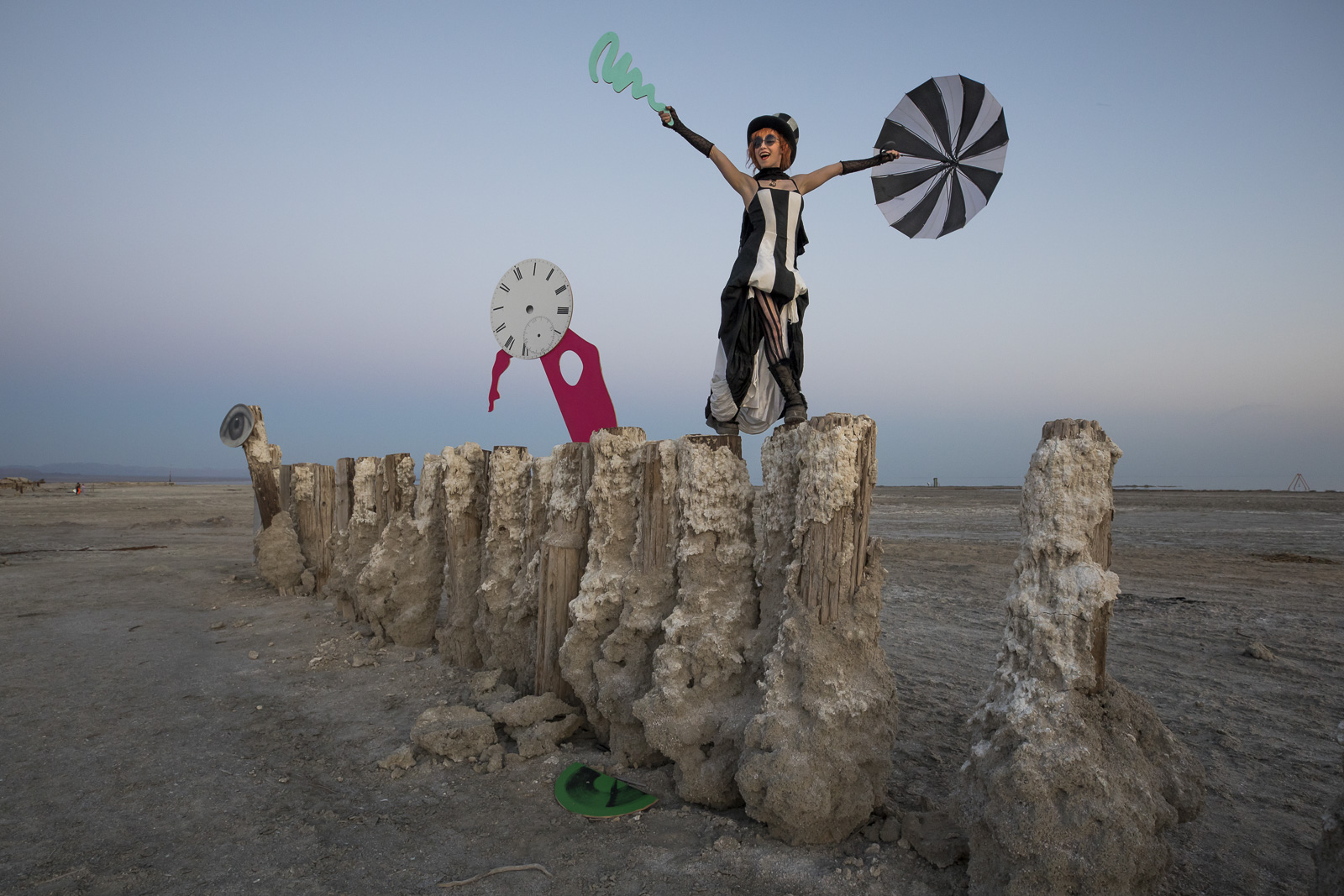 Seraphina, a stiltwalker and performance artist from Los Angeles, leads a procession along the Bombay Beach waterfront.