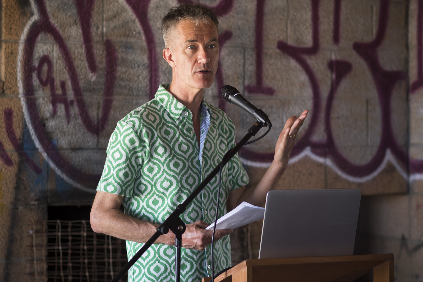 Geoff Dyer, the noted English writer and critic, speaks at the Biennale’s annual lecture series held in a vacant and graffiti-covered structure on the edge of town.