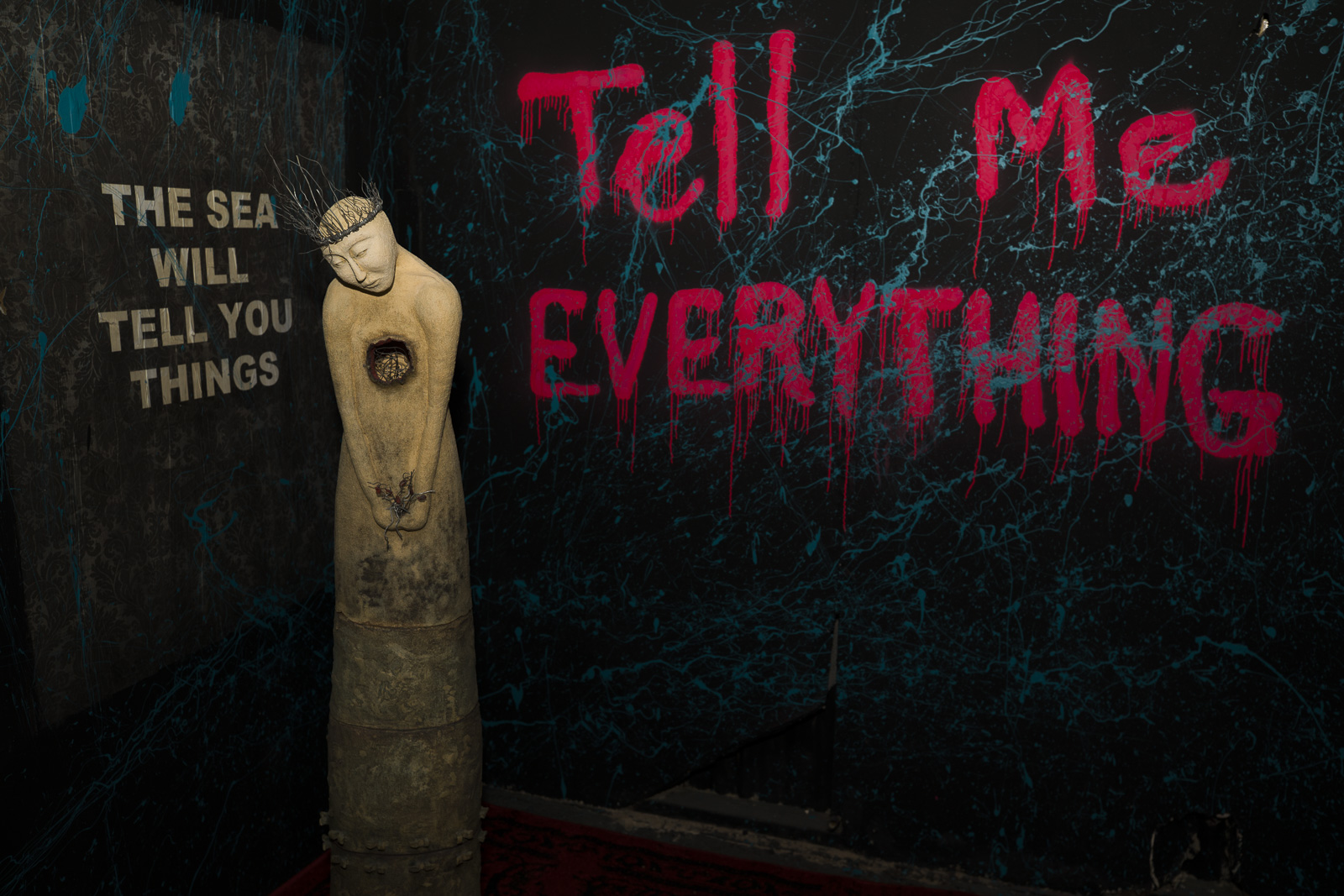 Detail from “Naked Revelations,” an installation by Israeli artist Moranne Layani at Museum #2 on a Bombay Beach side street. A sign at the museum encourages visitors to post photos taken there with the hashtag #theworldsshittiestmuseum
