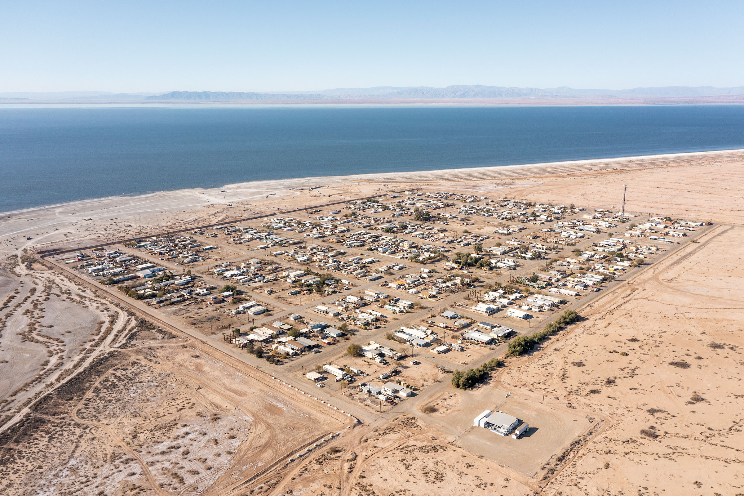 An aerial view of Bombay Beach on the eastern shore of the Salton Sea. At 223 feet below sea level, Bombay Beach is one of the lowest communities in the United States. It’s also one of the poorest.