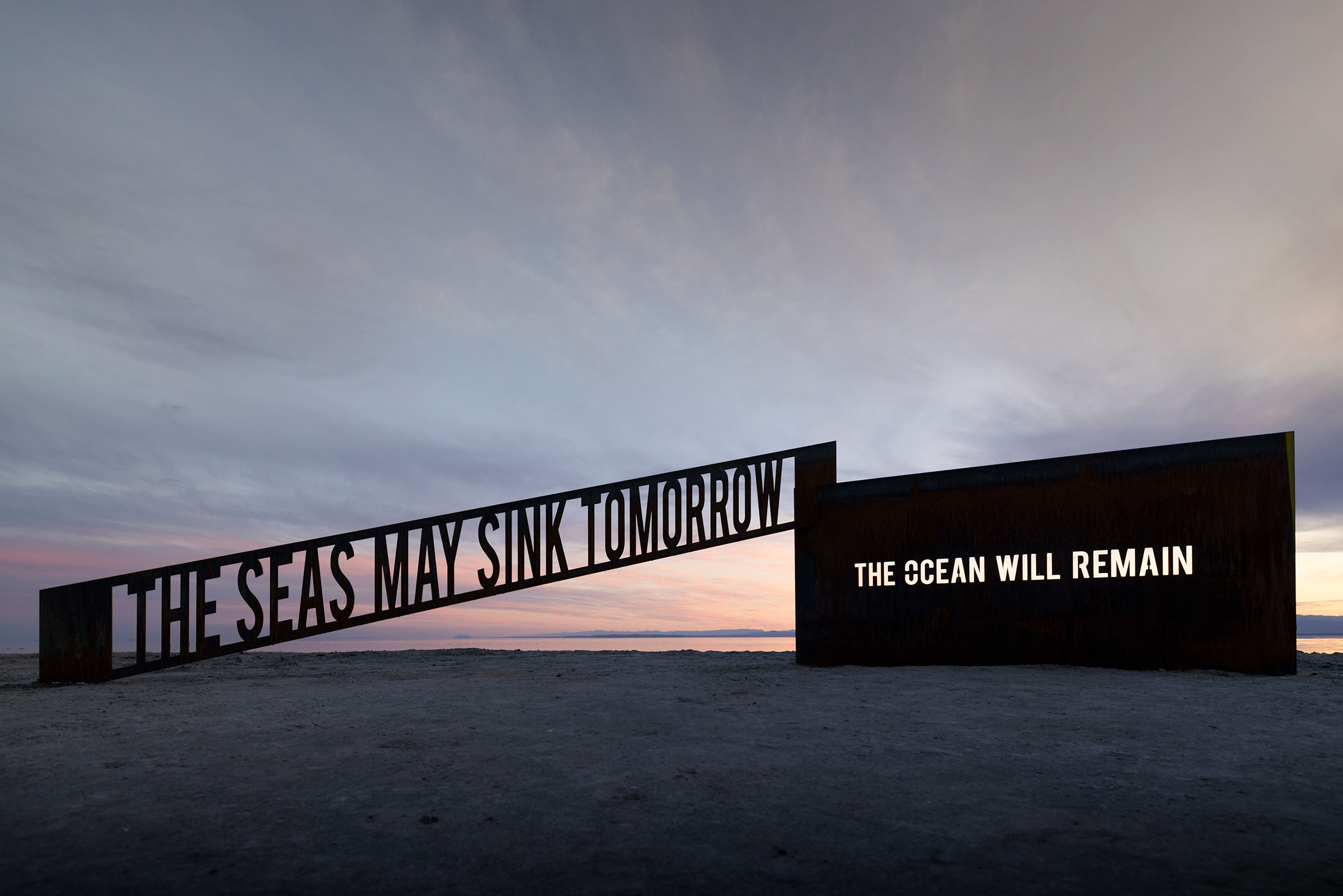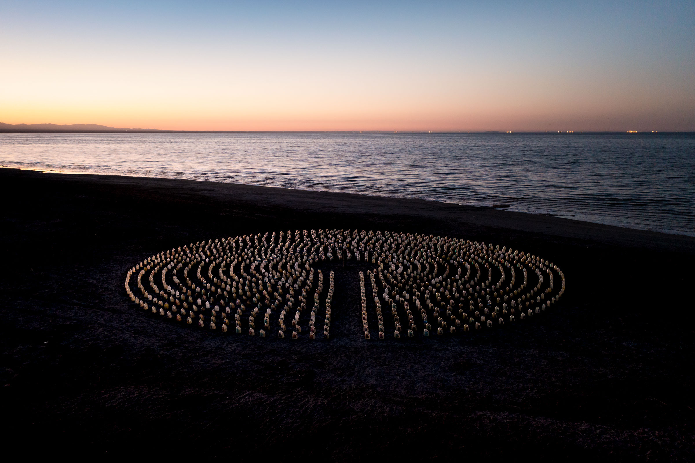 How many gallons of water does it take to grow a pound of almonds? This installation by Uwe Martin at the 2023 Biennale offered up a visual representation. Each point of light is a plastic bottle of sea water reflecting the sky in the early-morning twilight. Almonds are among the most water-intensive crops and it takes approximately 1,900 gallons to grow a pound of them.