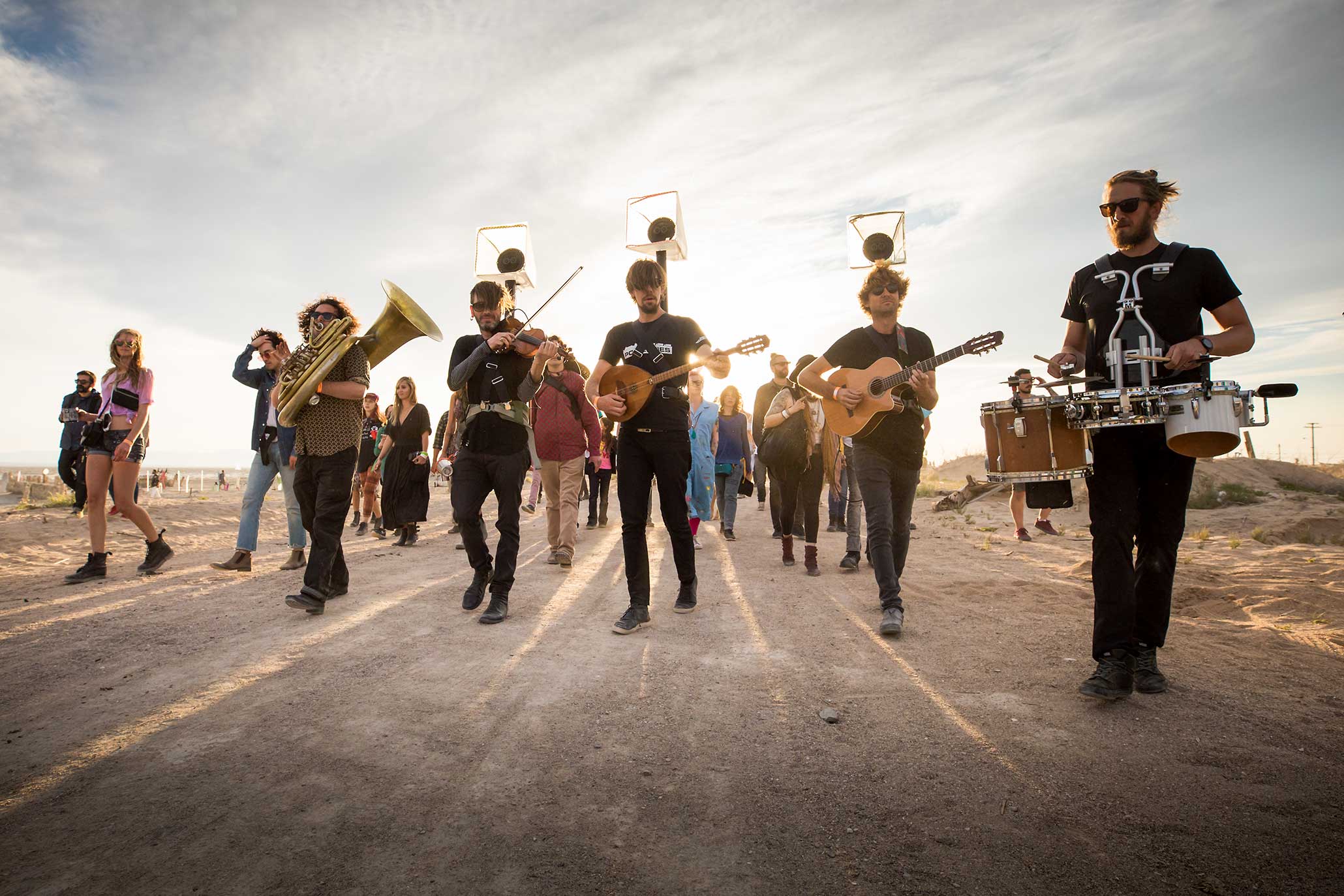 The Axon Orchestra performs in a procession along the waterfront at the 2019 Bombay Beach Biennale.