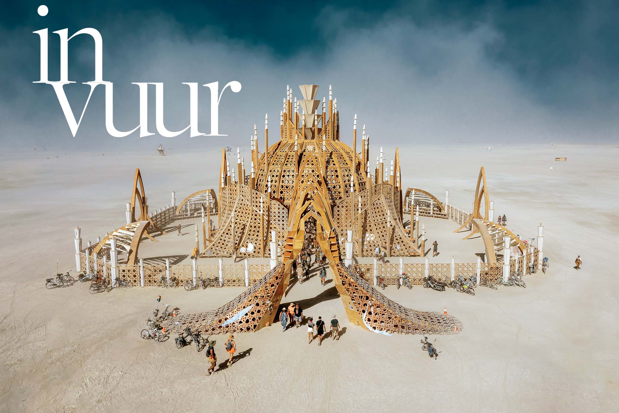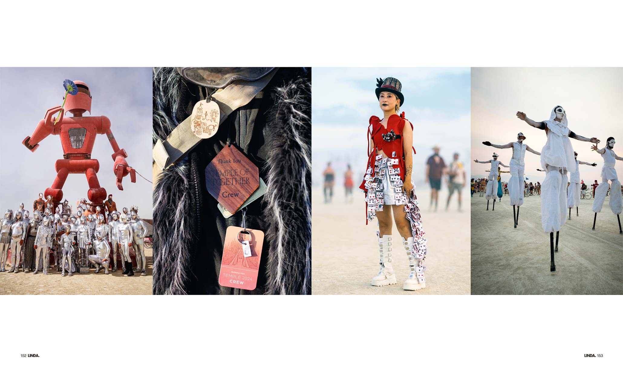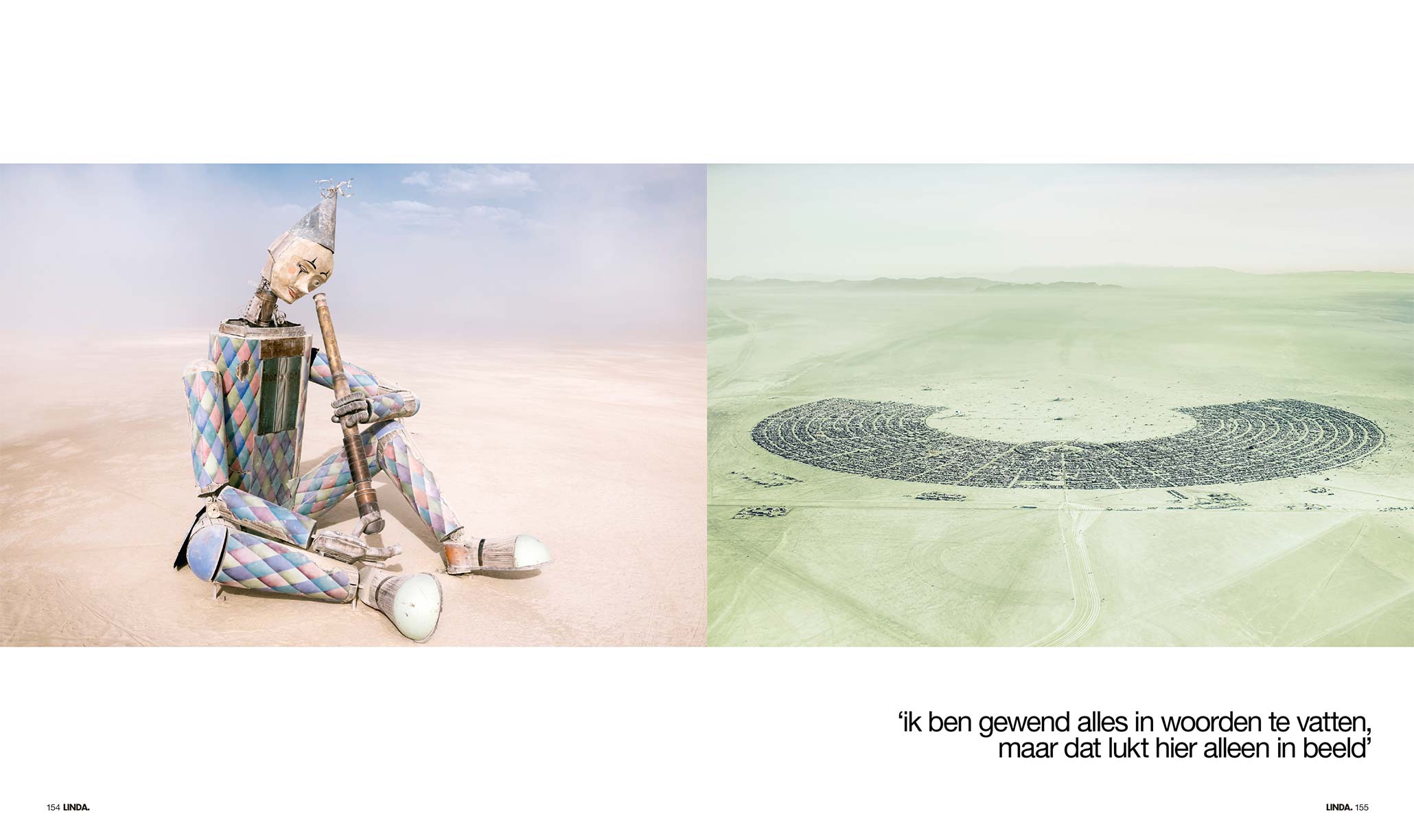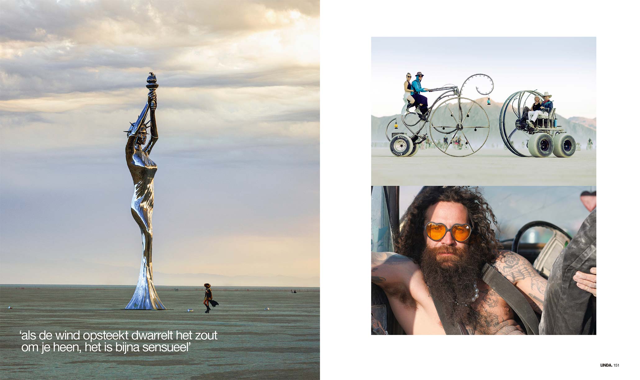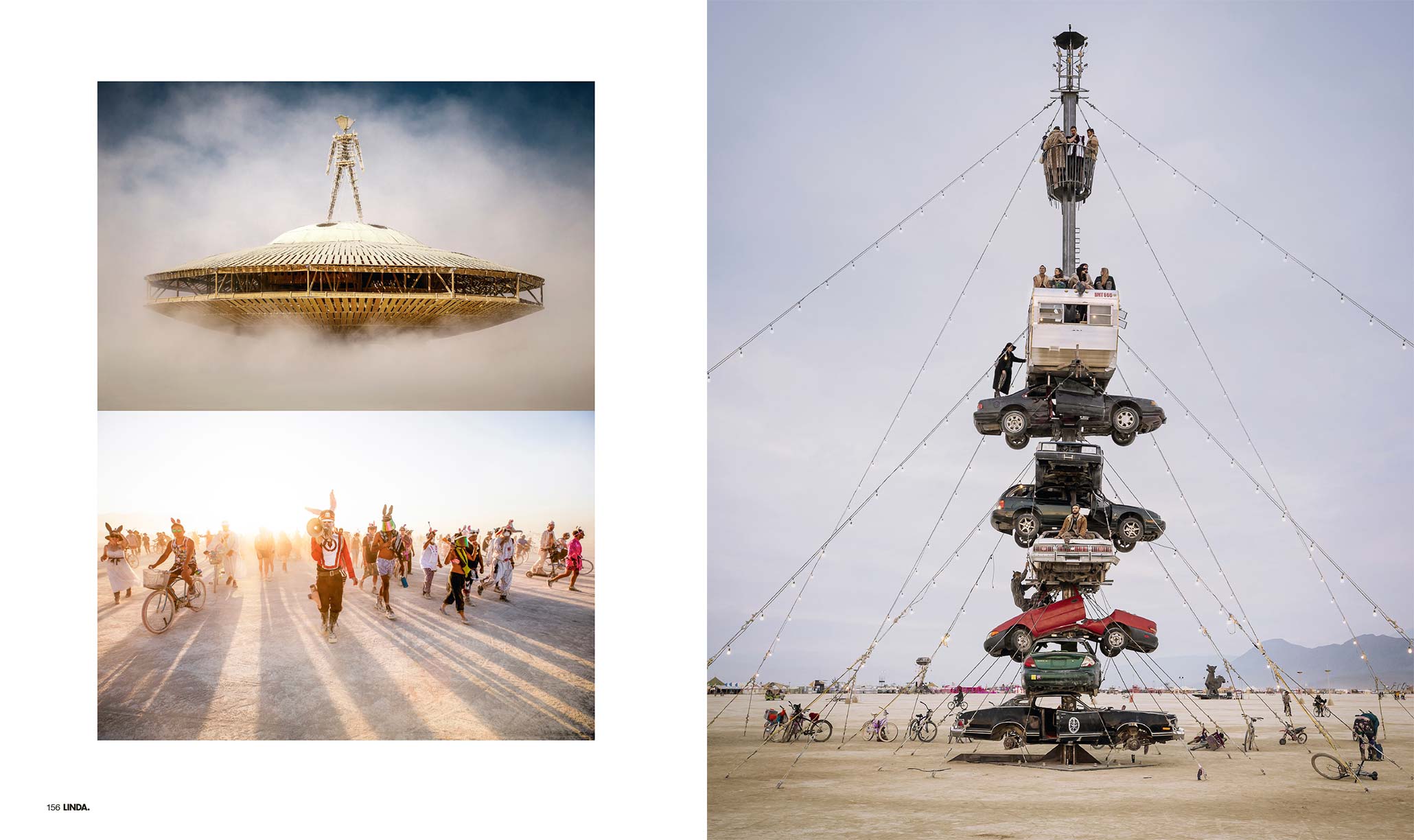 The festival takes place on a lakebed that dries up and cracks after the winter rains. By late summer, the desert floor is hard and chalky, “but the presence of seventy or eighty thousand people pulverizes the surface, turning it into extremely fine dust,” he says. “When the warm winds sweep through, the dust envelops you and moves across your skin like a soft caress. It’s almost sensual.”