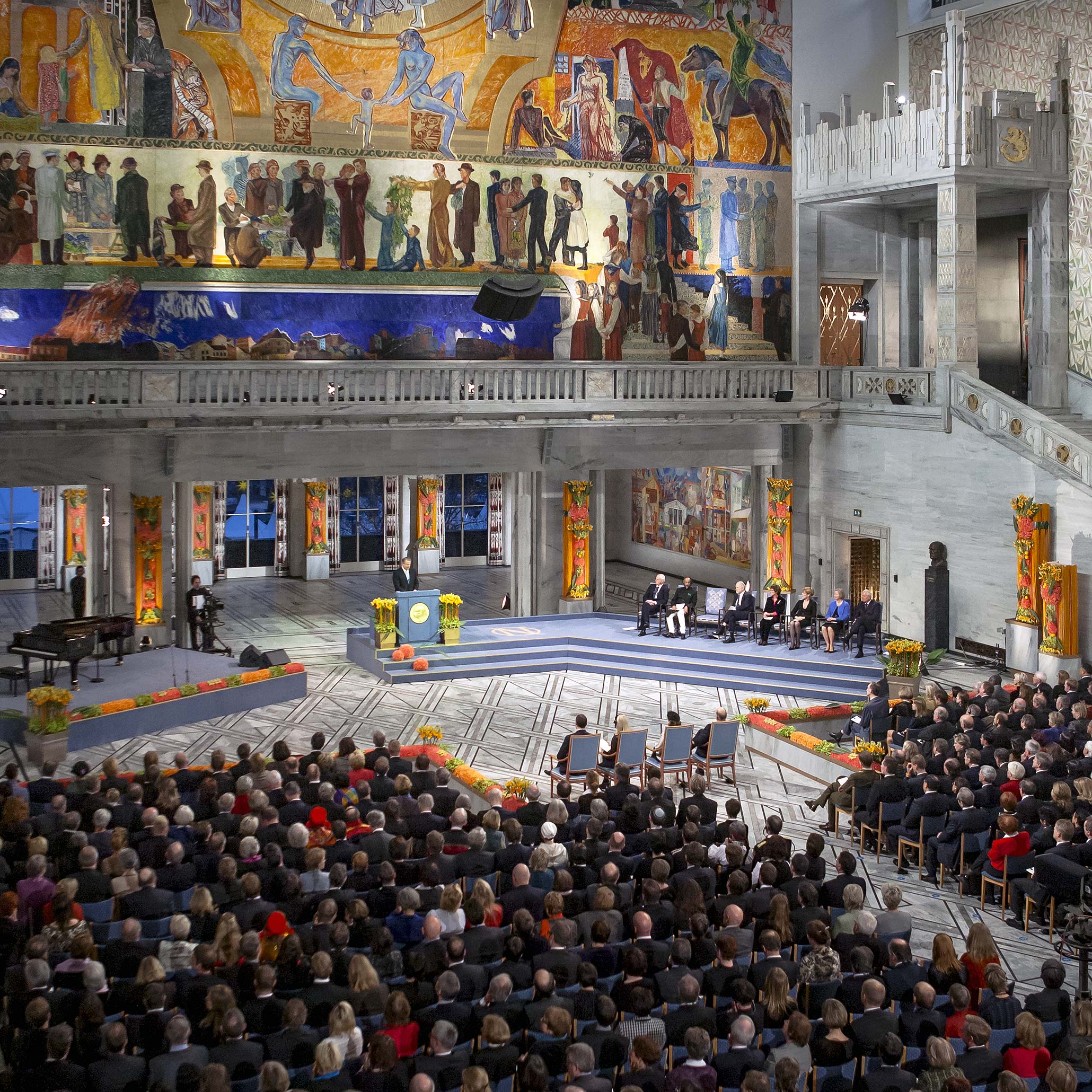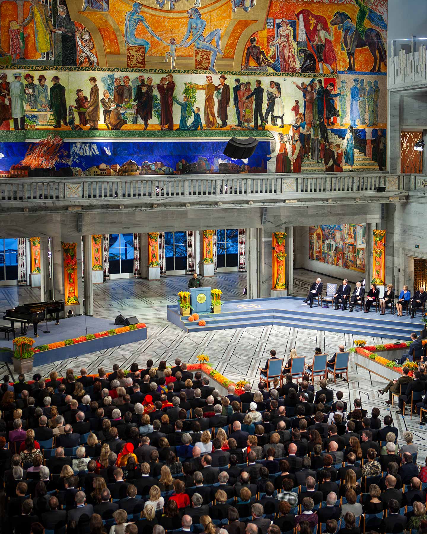 The award ceremony takes place in the spacious auditorium of Oslo City Hall, a palatial building that houses not only the city council and the city administration but also some of the most impressive art in Norway, including an exhilarating 85-foot mural by Henrik Sørensen, “The People at Work and Celebrating.” The auditorium can accommodate more than one thousand people.