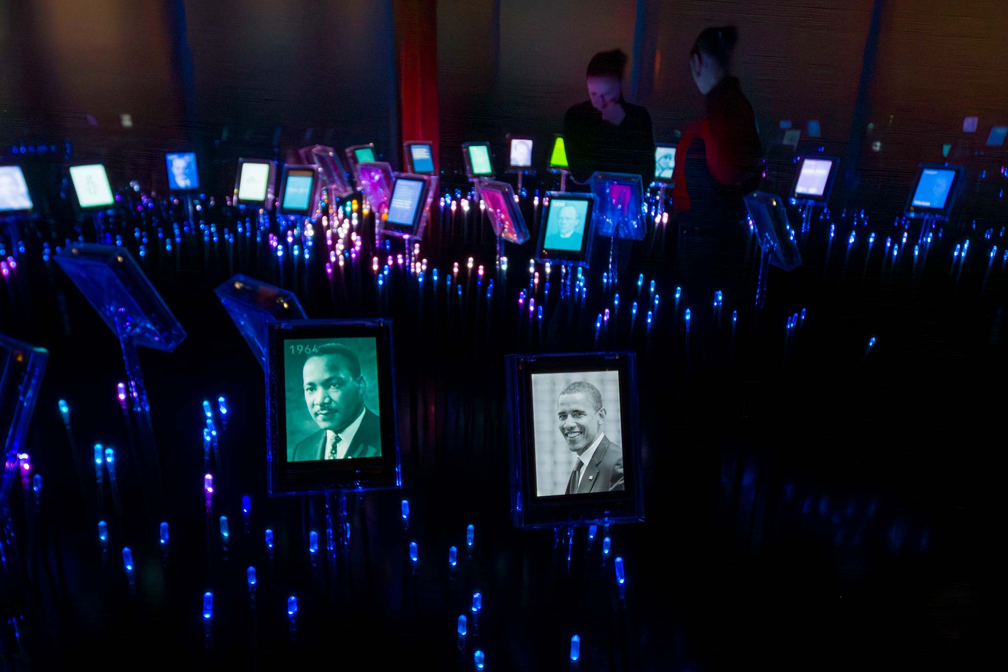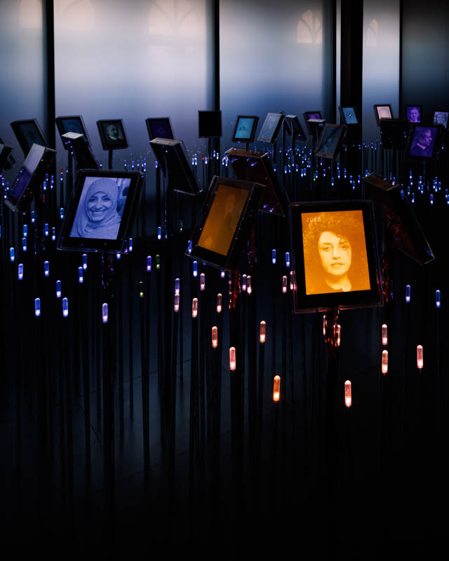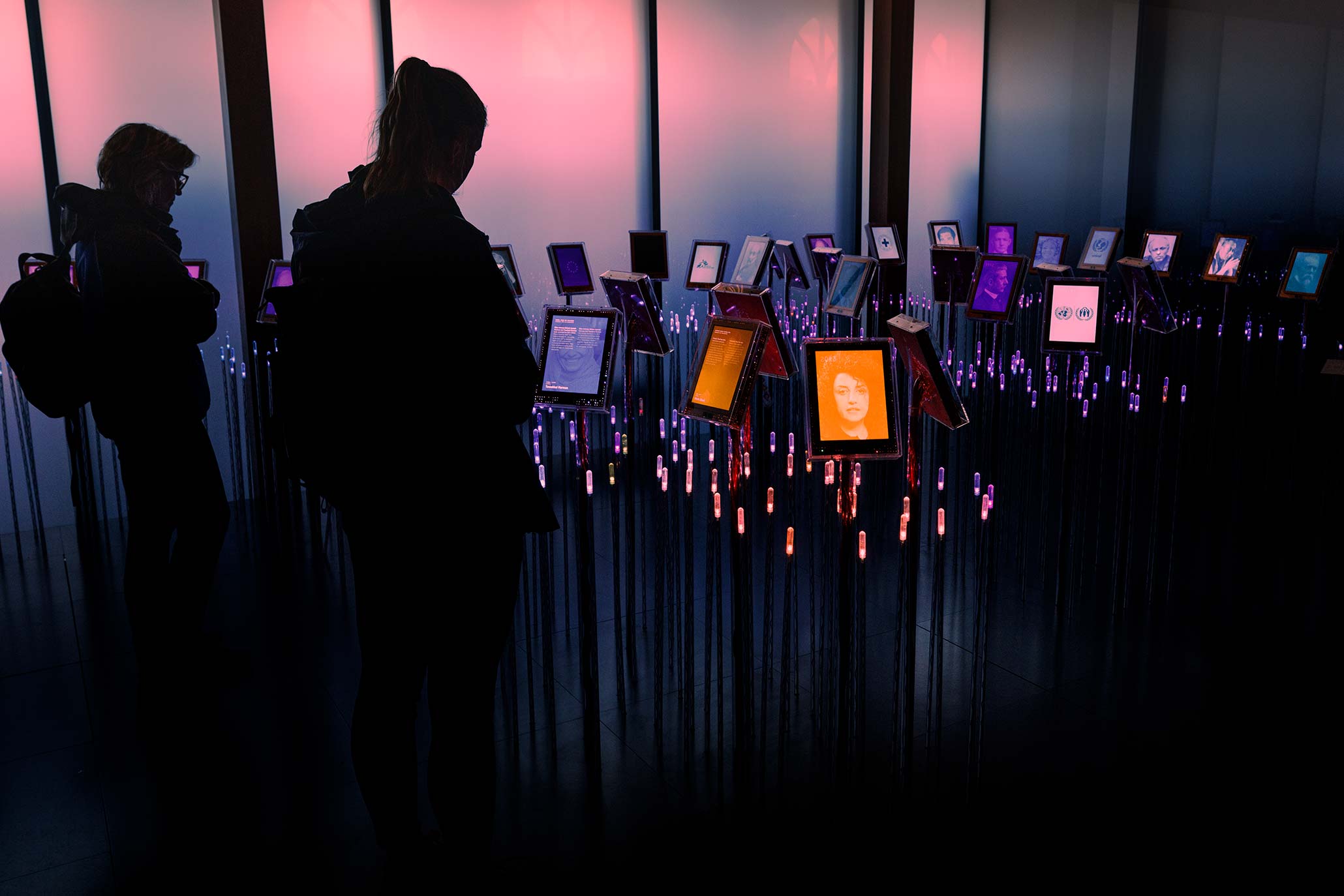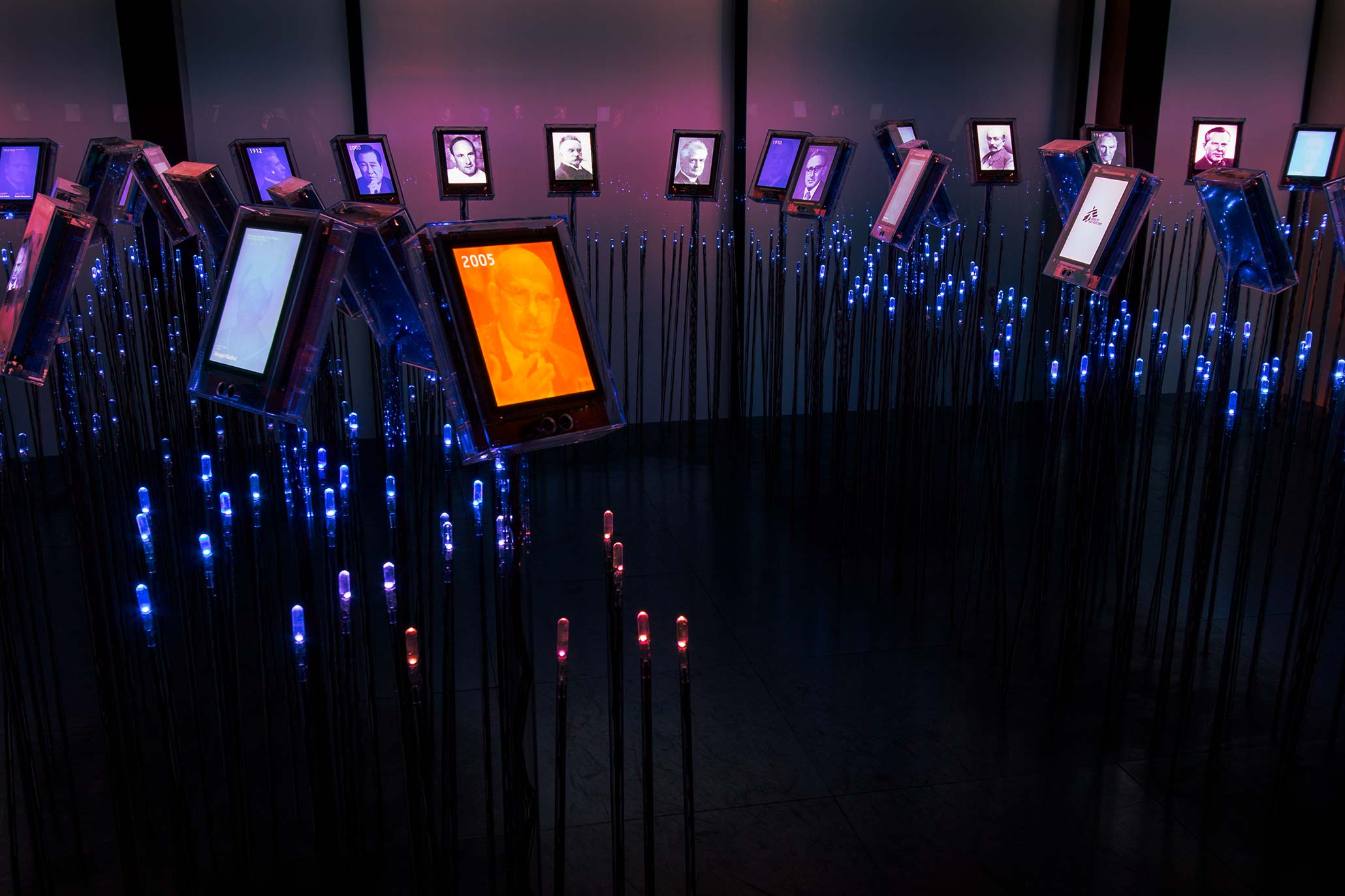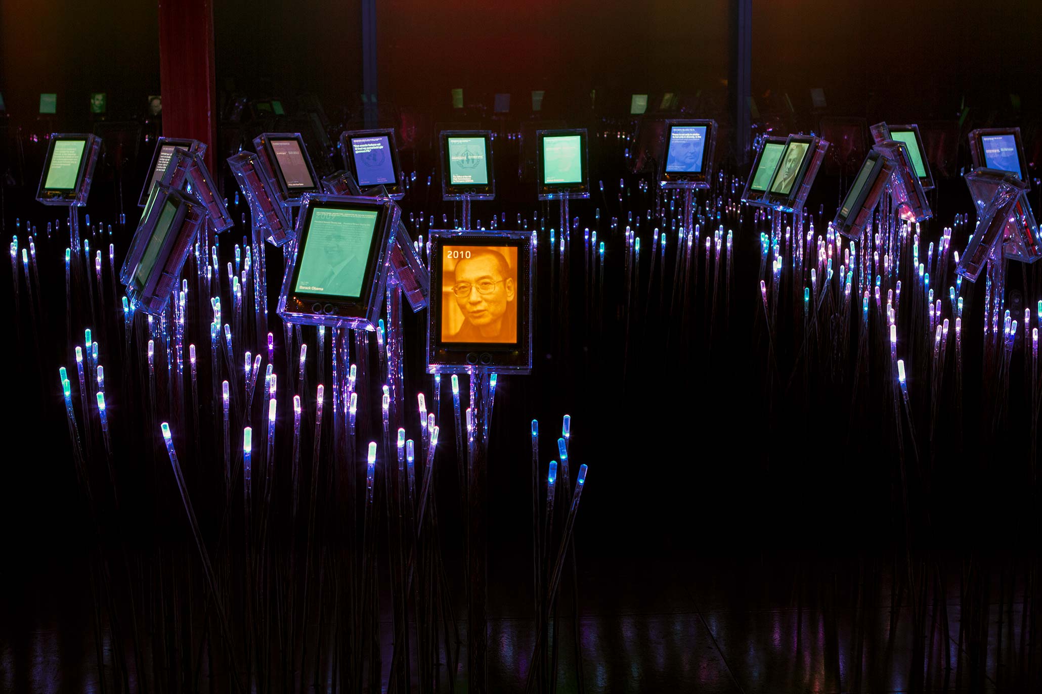 The Nobel Field is an interactive exhibition at the Nobel Peace Center in Oslo, Norway. Designed by David Small, the installation consists of a thousand points of light and sensor-equipped flat screens displaying each of the Nobel Peace Prize laureates and their achievements.