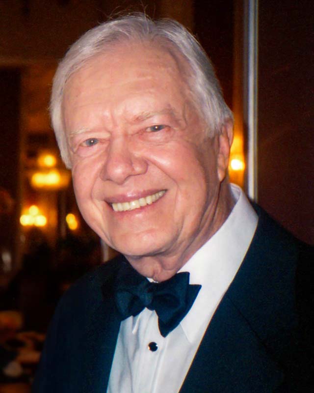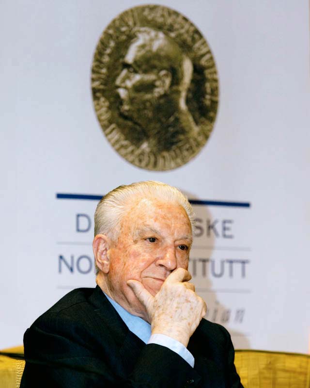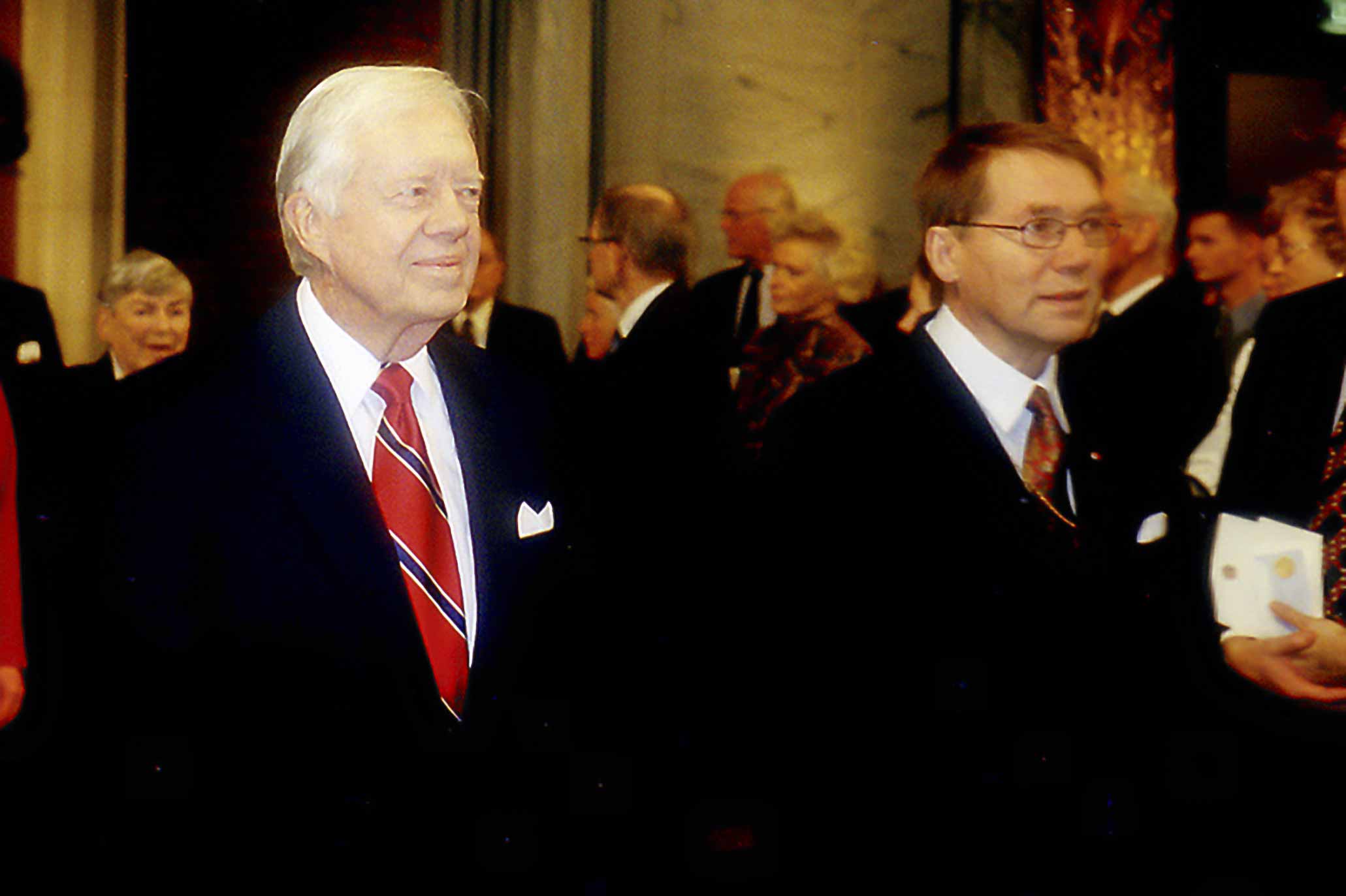 Former US president Jimmy Carter received the Peace Prize in 2002 “for his decades of untiring effort to find peaceful solutions to international conflicts, to advance democracy and human rights, and to promote economic and social development.” After accepting the prize and delivering his address, he exits Oslo City Hall with Gunnar Stålsett, then deputy leader of the Norwegian Nobel Committee, at his side.