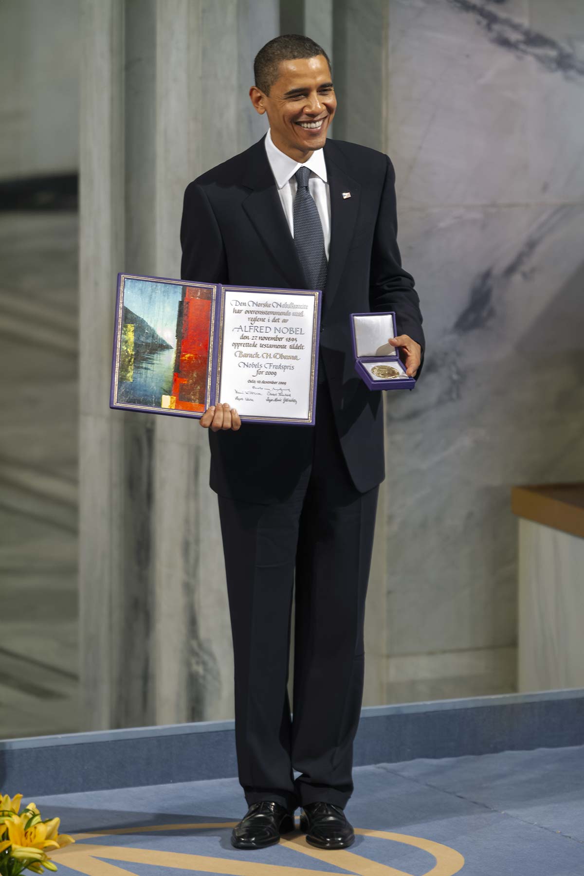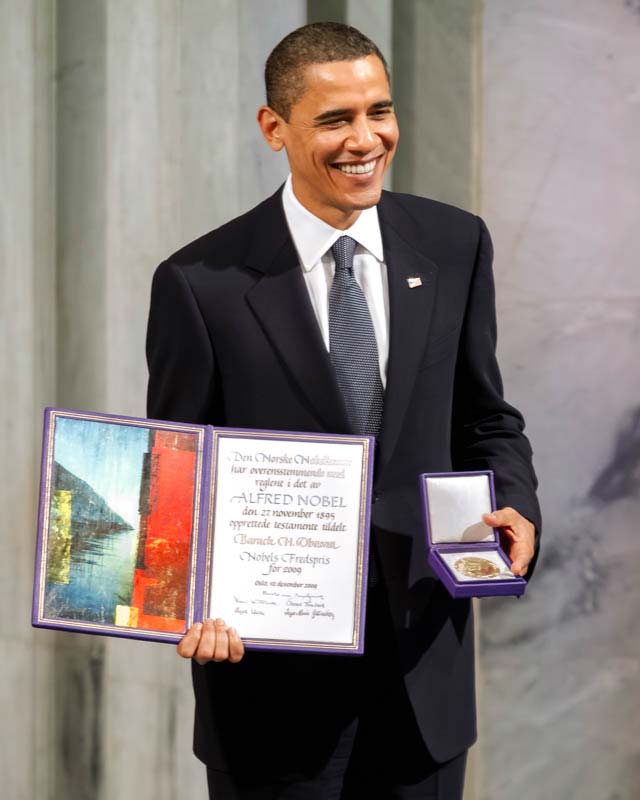 After accepting the 2009 award, Barack Obama smiles for the television cameras and the Norwegian royal family, displaying the official Nobel Peace Prize diploma and gold medal.