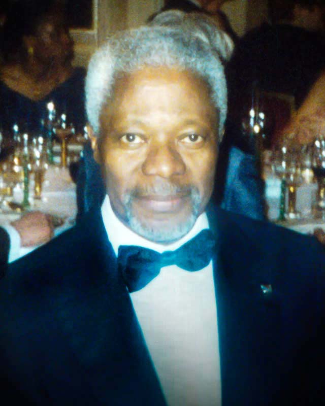 In the evening, the laureates and their families along with about 200 distinguished guests attend the Nobel banquet, a black tie affair held in their honor at Oslo’s Grand Hotel. Here John Hume, winner of the 1998 Nobel Peace Prize, attends the 2001 banquet celebrating the United Nations and its secretary general Kofi Annan, who had accepted the award earlier in the day.