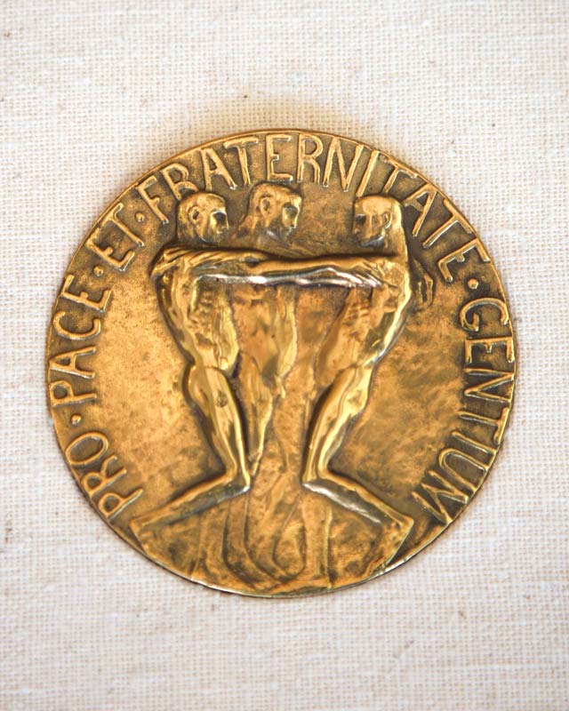 The Nobel Peace Prize gold medal was designed by the great Norwegian sculptor Gustav Vigeland. This replica is on display at the Nobel Institute in Oslo.