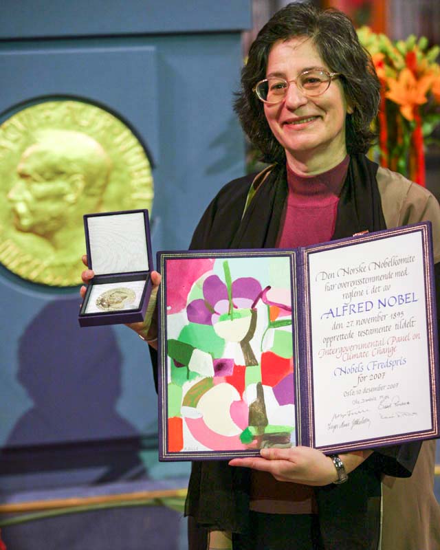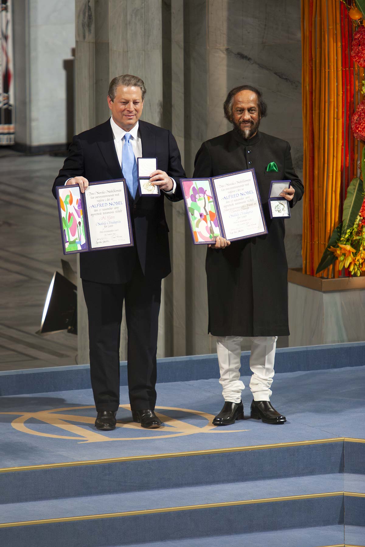 Al Gore and Rajendra Pachauri, chairman of the Intergovernmental Panel on Climate Change, display their diplomas and gold medals after accepting the 2007 Nobel Peace Prize