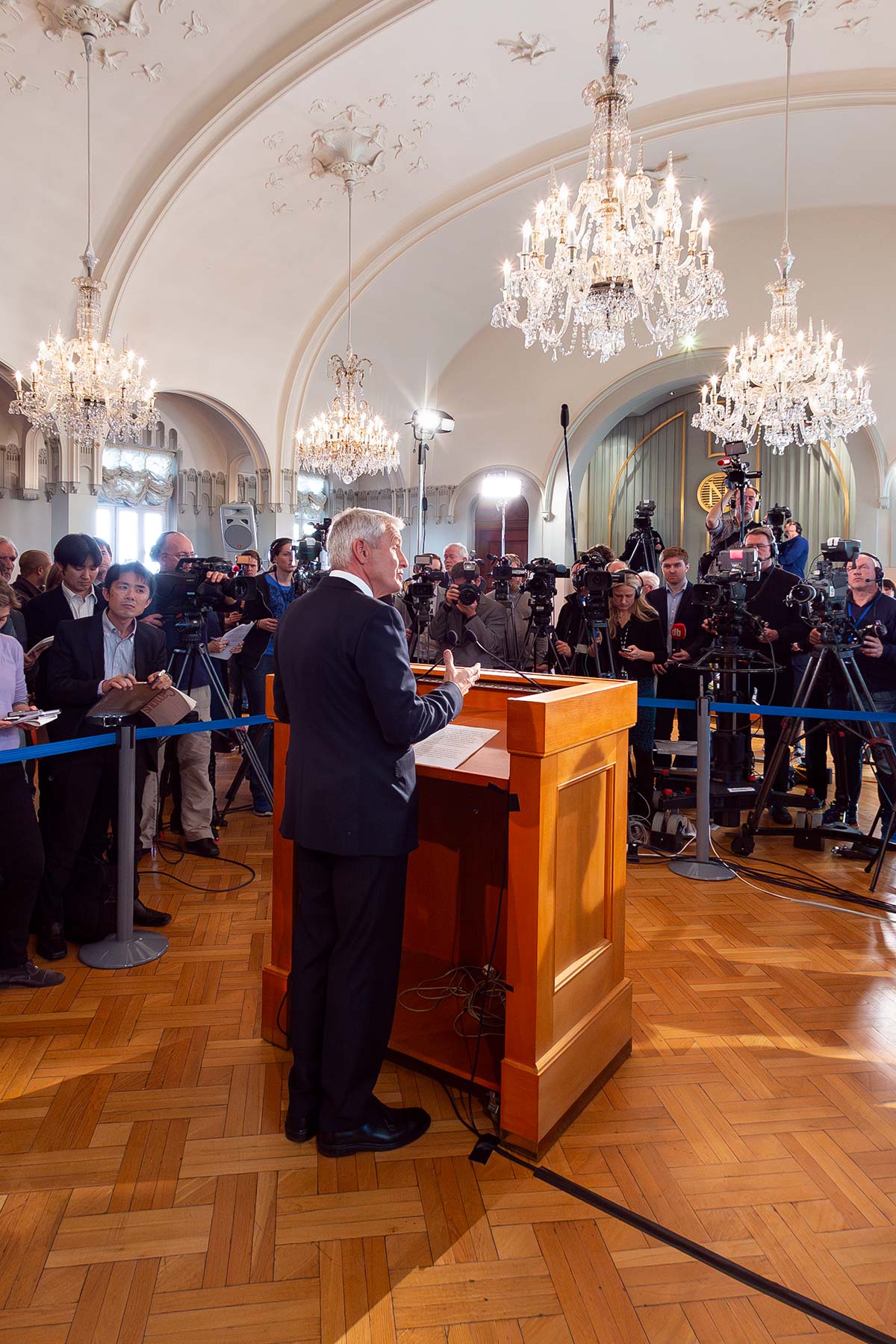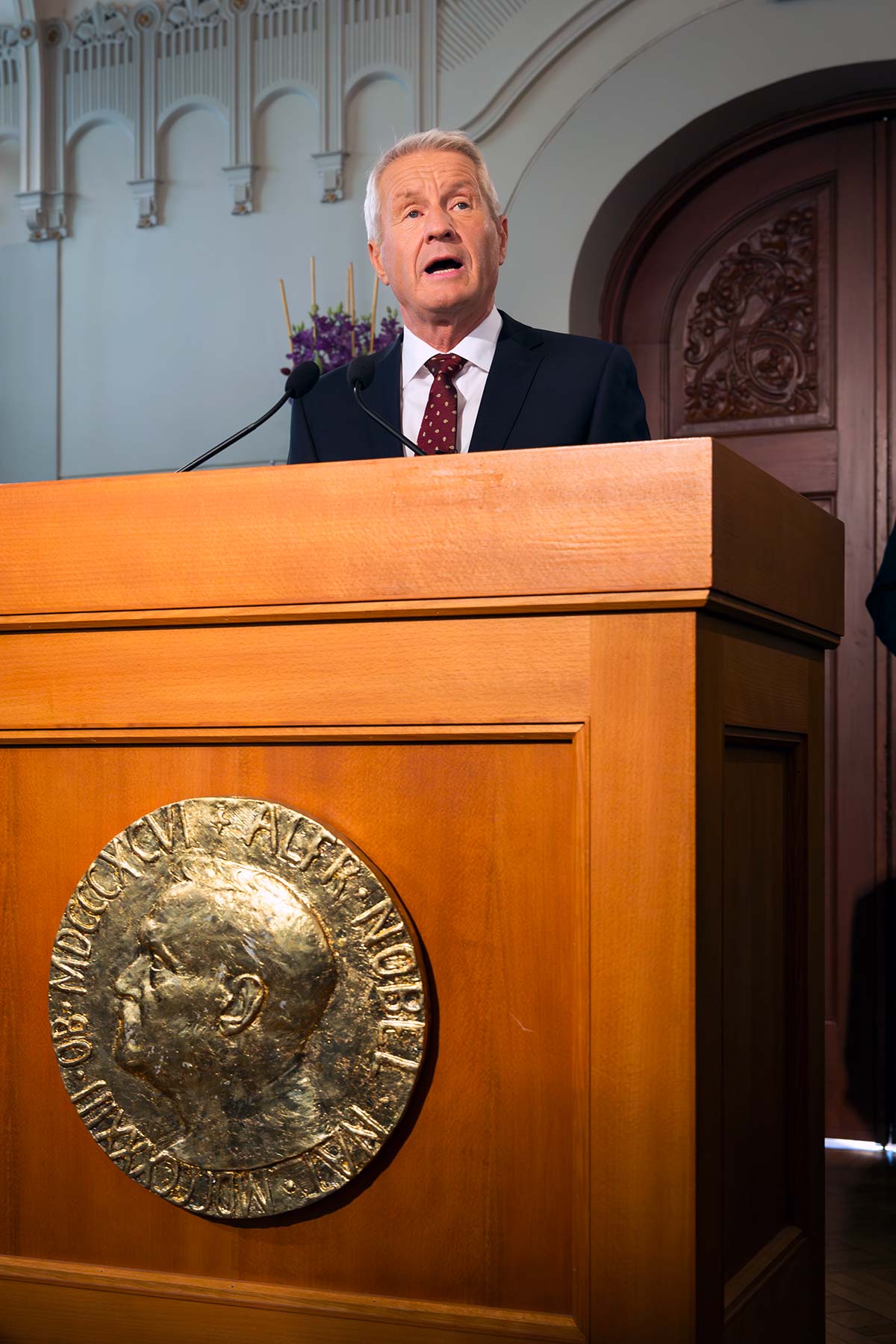 Here Thorbjørn Jagland, then chairman of the Norwegian Nobel Committee, reveals the winner of the 2013 award — the Organization for the Prohibition of Chemical Weapons (OPCW), a U.N. watchdog group. Each year, the announcement consists of a short written statement. The chairman then takes a few questions from the international press corps.