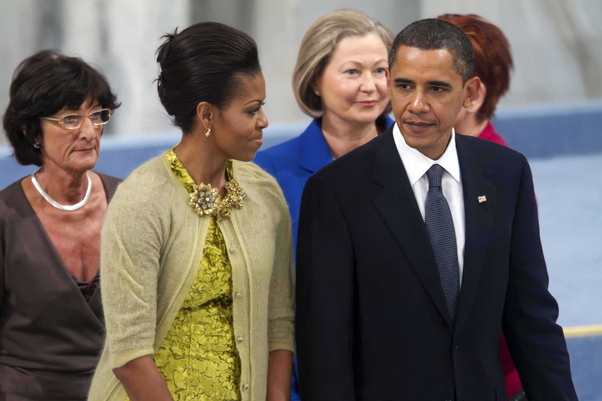 At the close of the 2009 award ceremony, Barack Obama and First Lady Michelle Obama exit Oslo City Hall, followed by members of the Norwegian Nobel Committee.