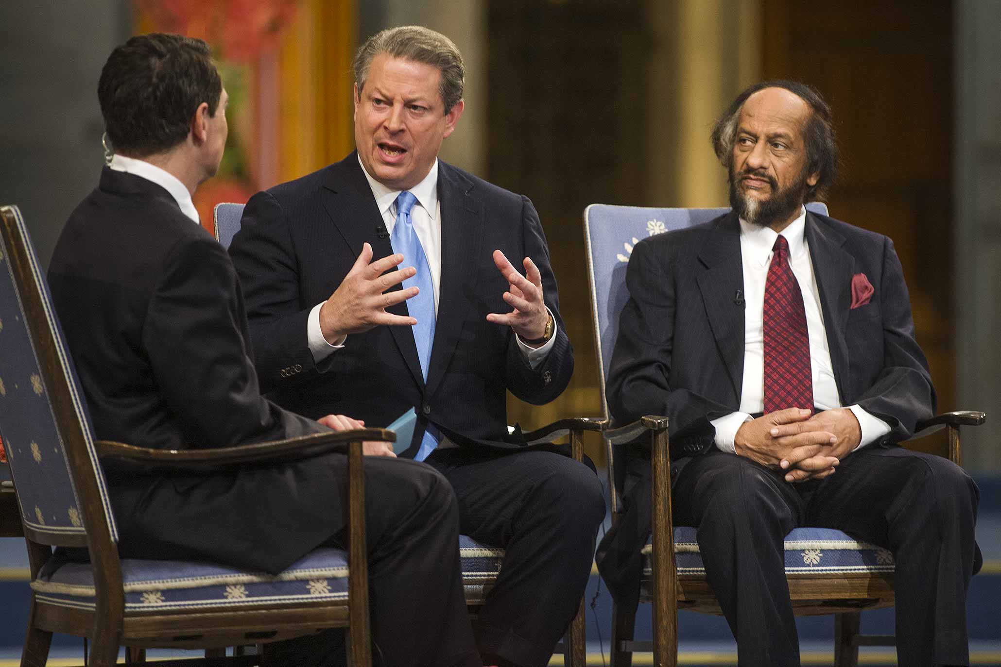 An internationally-televised interview with the Nobel Peace Prize laureate or laureates takes place after the award ceremony. Here Al Gore and Rajendra Pachauri sit down for an hour-long interview with CNN’s Jonathan Mann. Gore and Pachauri seemed especially comfortable and relaxed in front of the television cameras. In a poignant moment, Al Gore revealed that despite his initial doubts about Pachauri, he had come to respect and admire the IPCC chairman and now considered him a personal friend.