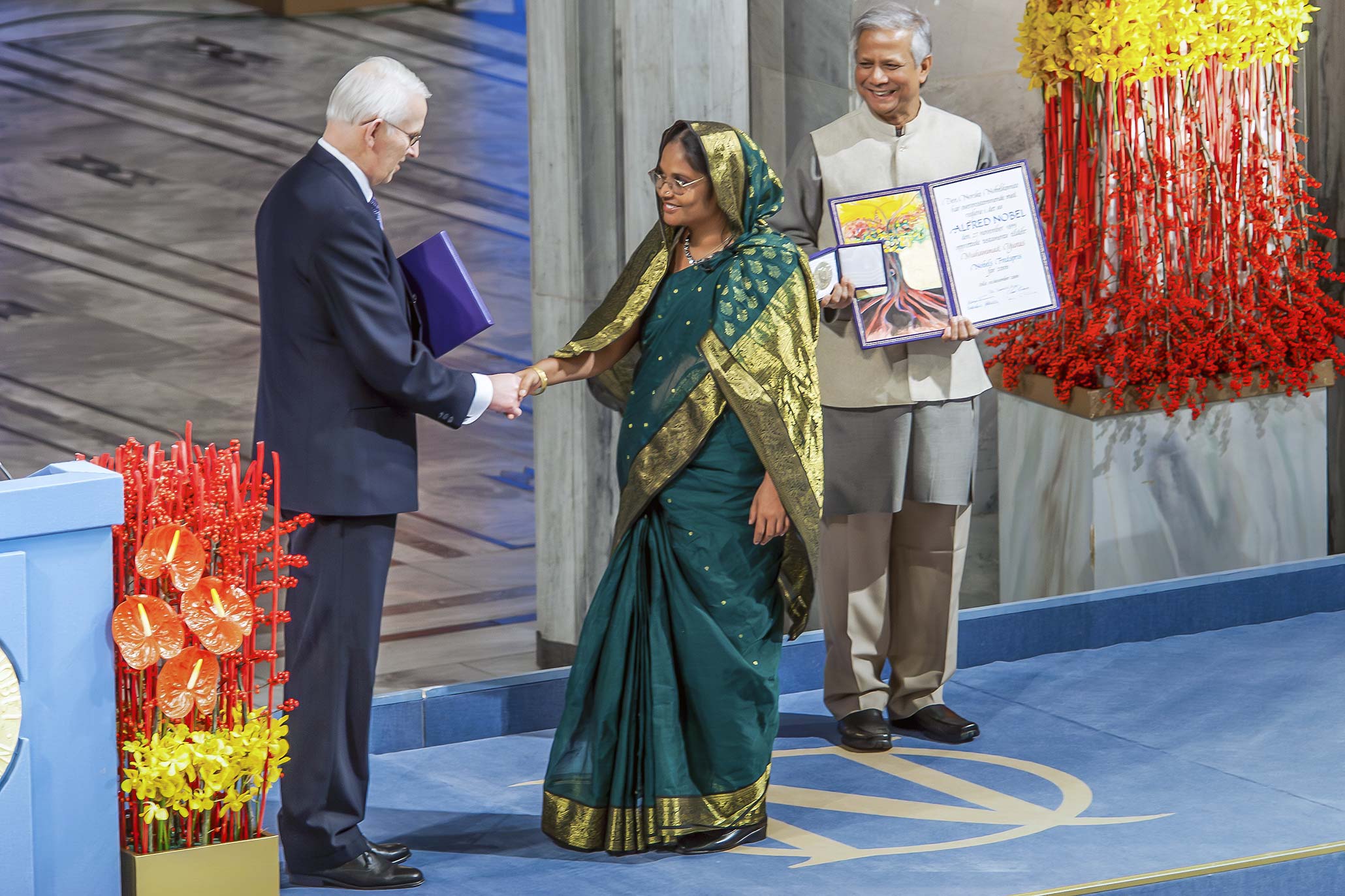 Muhammad Yunus and the Grameen Bank were jointly awarded the 2006 prize. Here Mosammat Taslima Begum, representing the Grameen Bank, accepts the diploma and gold medal from Norwegian Nobel Committee chairman Ole Danbolt Mjøs.