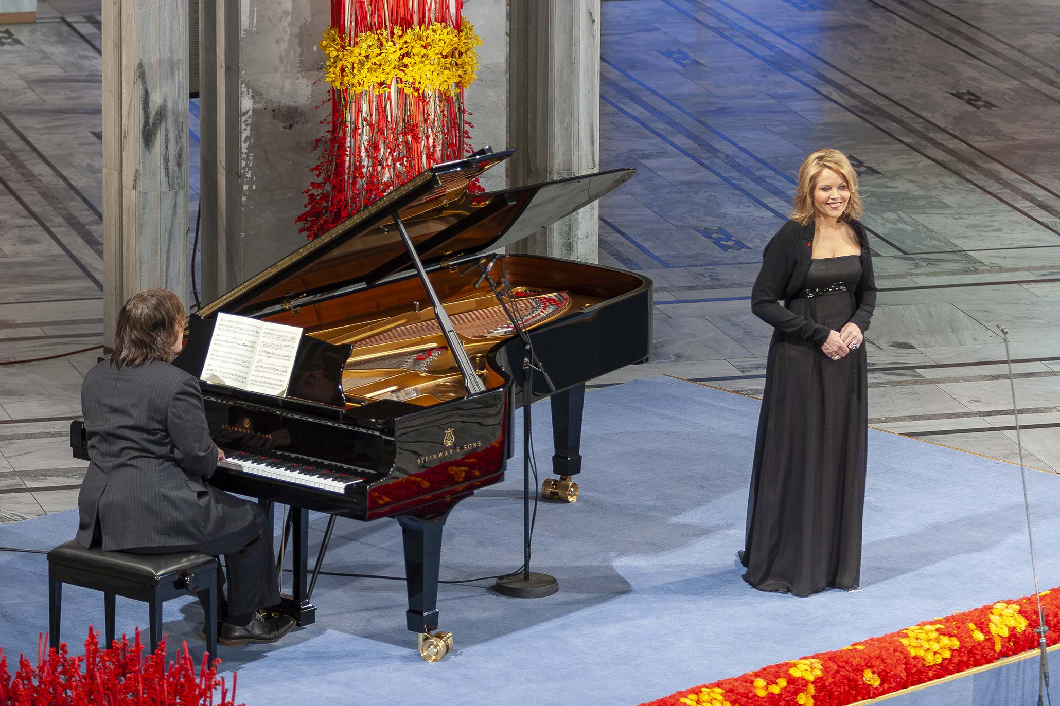The Nobel Peace Prize award ceremony often includes performances by celebrated classical musicians and opera singers, such as Italian tenor Andrea Bocelli who sang Schubert’s “Ave Maria” in 2004, or cellist Yo-Yo Ma who performed two suites by Bach in 2005. Here the noted American soprano Renée Fleming performs a section from Mozart’s “Exsultate, jubilate,” accompanied on piano by Christian Ihle Hadland, at the 2006 award ceremony.