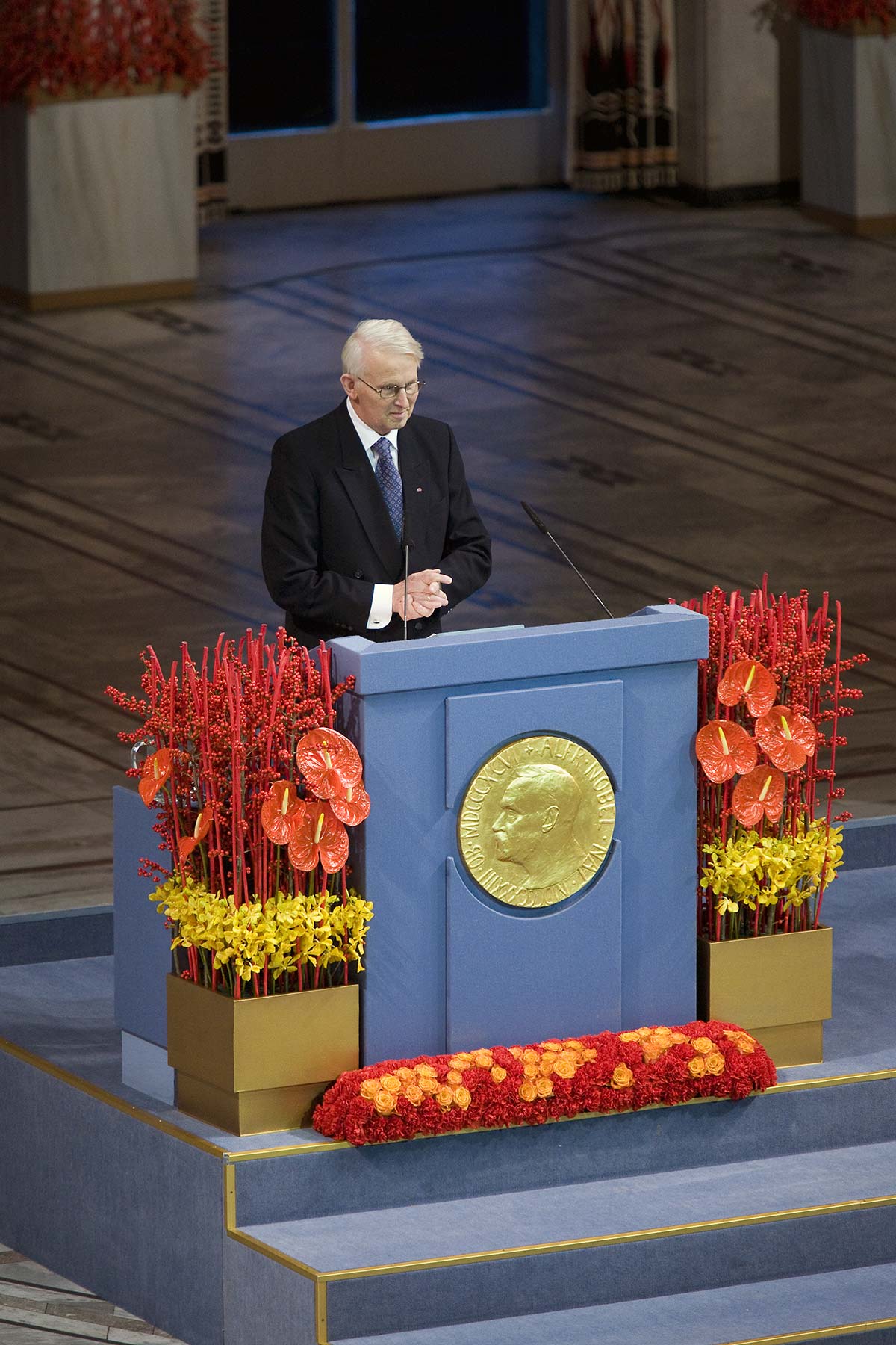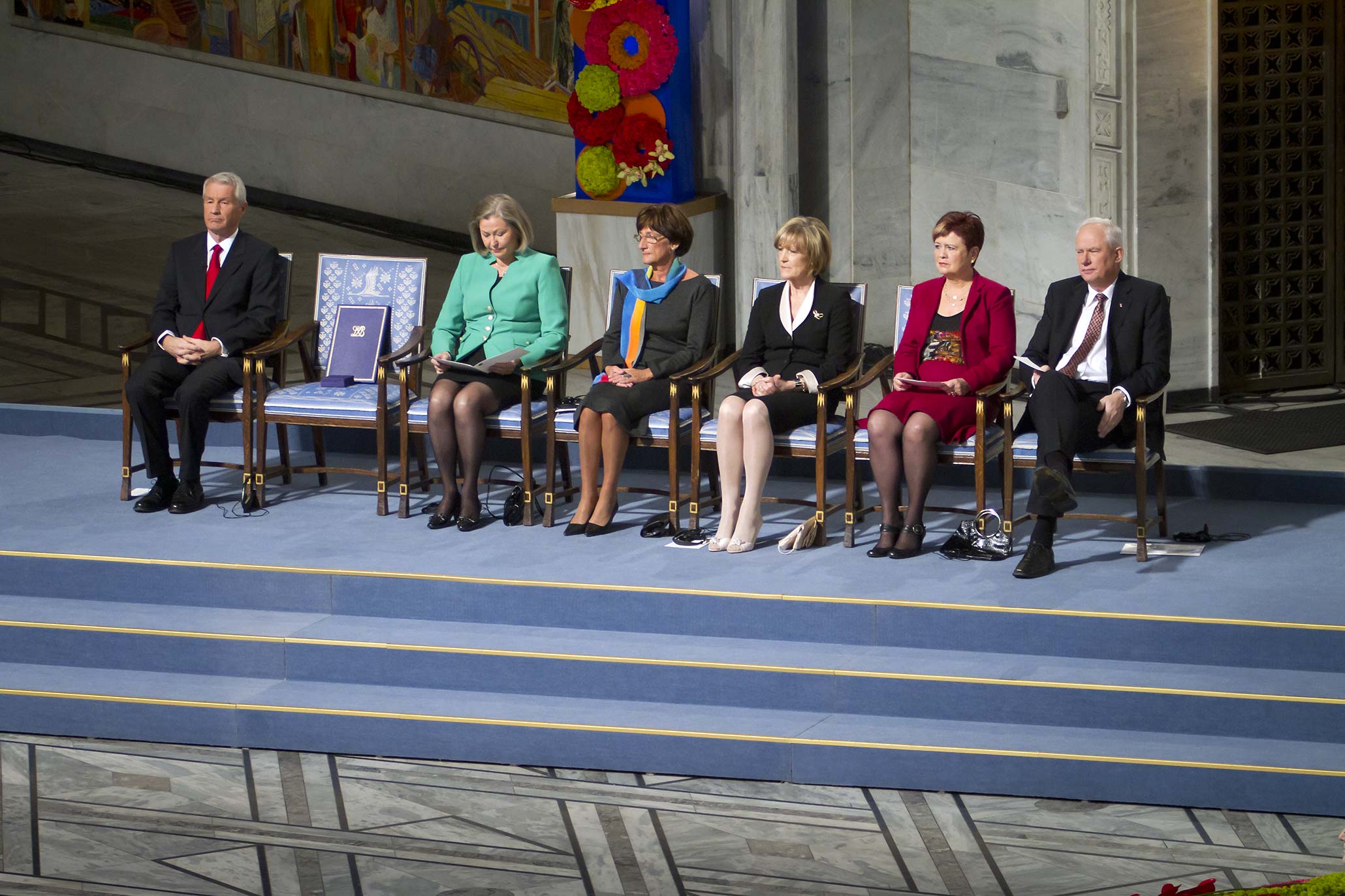 The five-member Norwegian Nobel Committee and its permanent secretary are seated on the dais during the award ceremony. The committee chair sits to the far left (as he or she is the first to lecture). The recipient of the prize is traditionally seated second from the left. But in 2010 the chair was empty, as the winner of that year’s prize — the jailed Chinese dissident Liu Xiaobo — was barred from traveling to Oslo. 2010 marked the first time in more than 80 years that a laureate, or close relative of the laureate, had been unable to accept the prize in person.