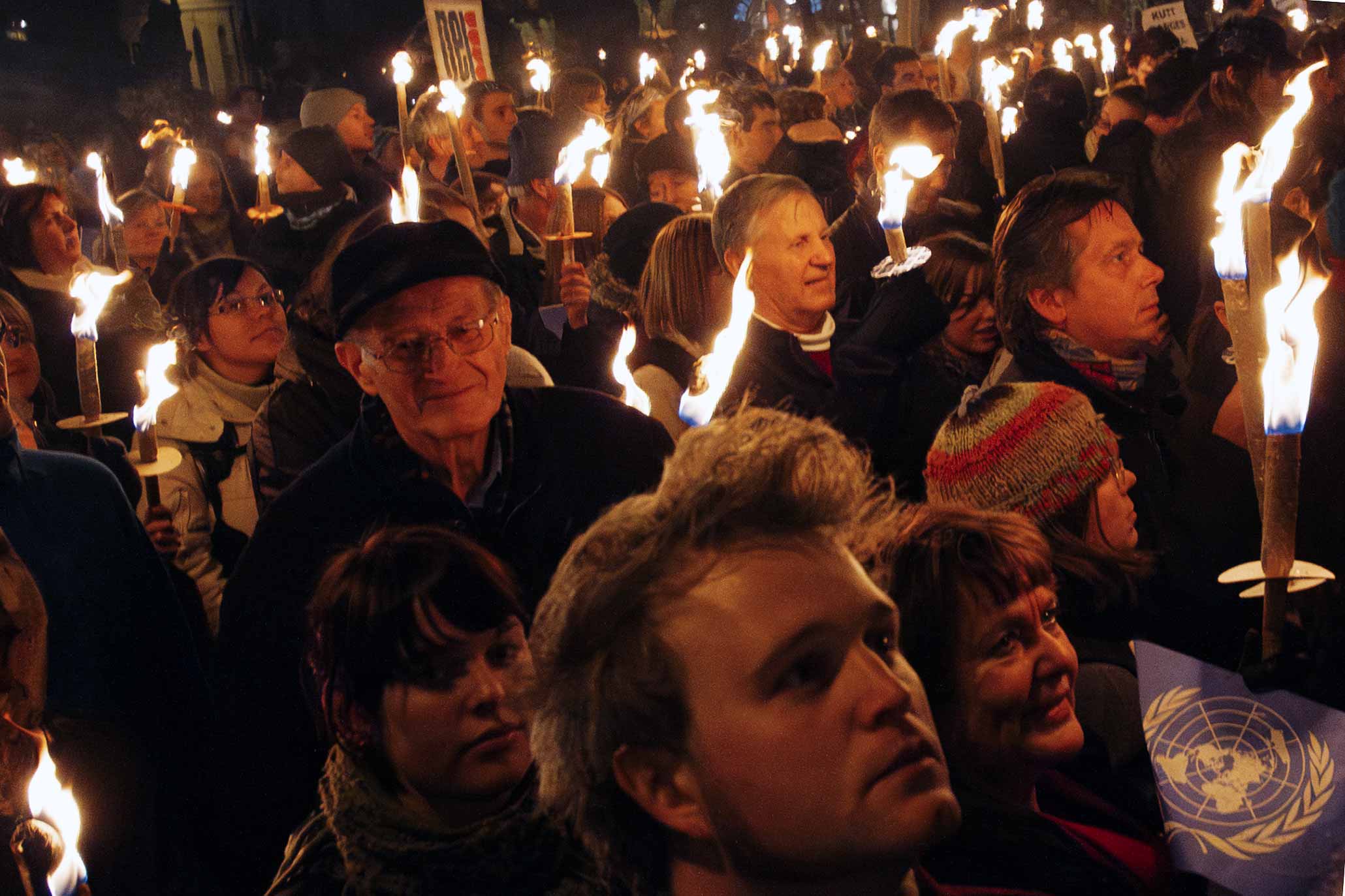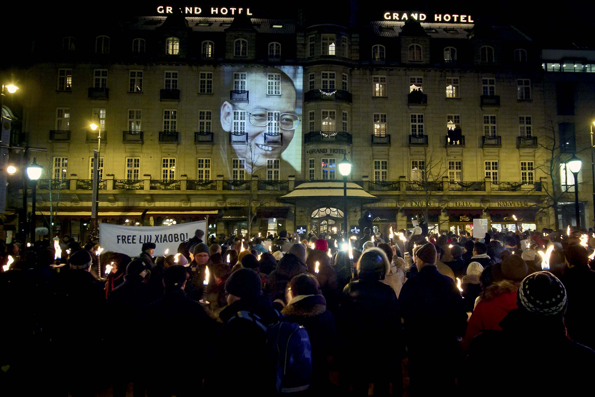 Following the 2010 Nobel Peace Prize award ceremony for imprisoned Chinese dissident Liu Xiaobo, a crowd of several hundred people marched in a procession, many carrying banners and torches, down Oslo’s main boulevard, Karl Johans Gate, to the hotel where the laureates usually stay during their visit to Norway. In Liu’s absence, a portrait of him was projected on the facade of the hotel.