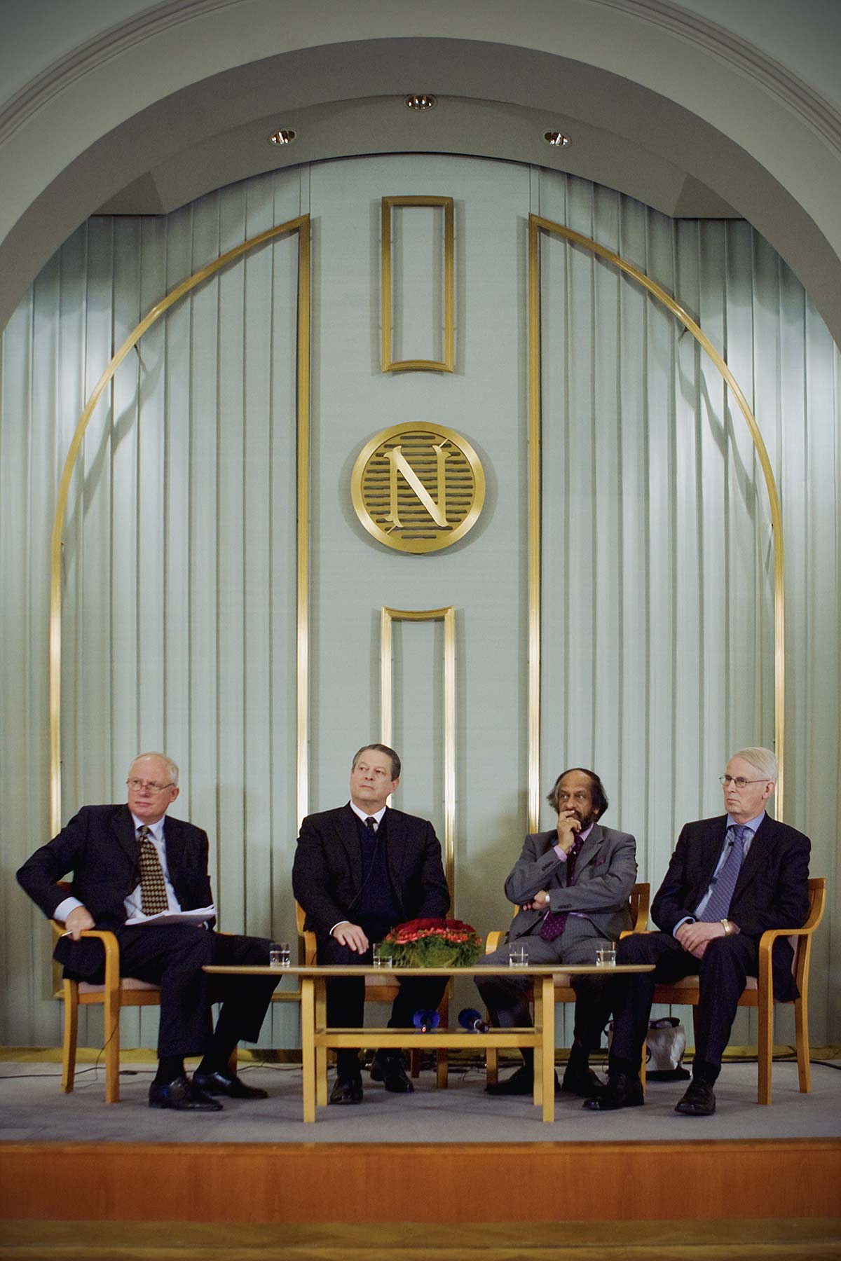 Al Gore and Rajendra Pachauri, chairman on the IPCC, spoke with members of the press, joined here by Geir Lundestad, then director of the Nobel Institute (left), and Ole Danbolt Mjøs, then chairman of the Nobel Committee (right). The briefing was held in the Grand Hall of the Nobel Institute, a space previously used for the actual award ceremony.