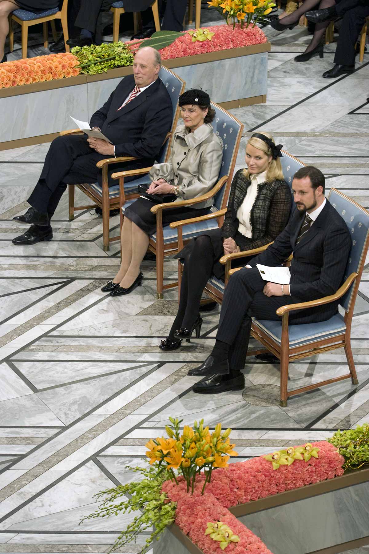 The Norwegian royal family generally attends the award ceremony each year. Here King Harald, Queen Sonja, Crown Princess Mette Marit and Crown Prince Haakon are seated front and center, facing the podium, at the 2007 ceremony honoring Al Gore and the Intergovernmental Panel on Climate Change.