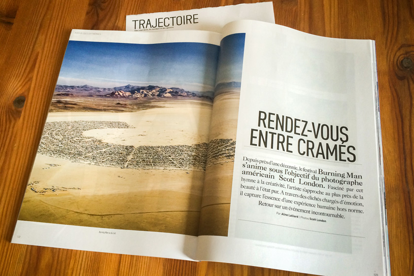 The current issue of Swiss magazine Trajectoire features a 10-page feature about my Burning Man photography. Most of the images were taken this past year. The spread also includes a write-up by Aline Lalliard that describes Burning Man and delves into some biographical stuff about me. Freely translated from the French, the intro reads: